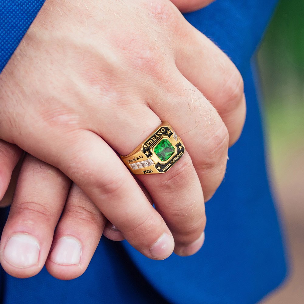 This class ring can be customized with a birthstone, the graduate's school name, graduation year, the graduate’s name, and other graduation information, making it a one-of-a-kind keepsake.