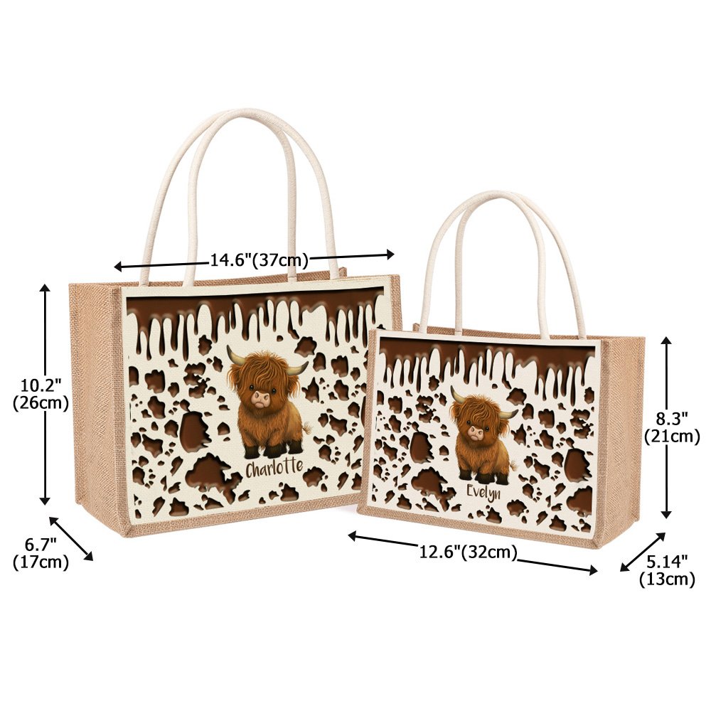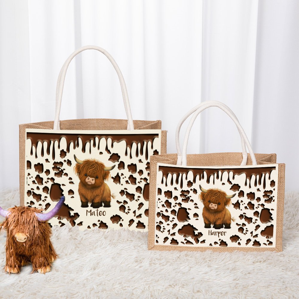 This jute bag features a super cute pattern of Highland cows from Scotland, offering a soft and fuzzy visual texture that is beloved among women. Additionally, this bag provides a personalized name customization service. Enter your name, and we'll create a one-of-a-kind essential companion for your travels.