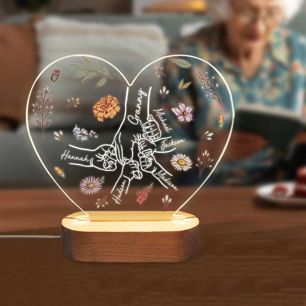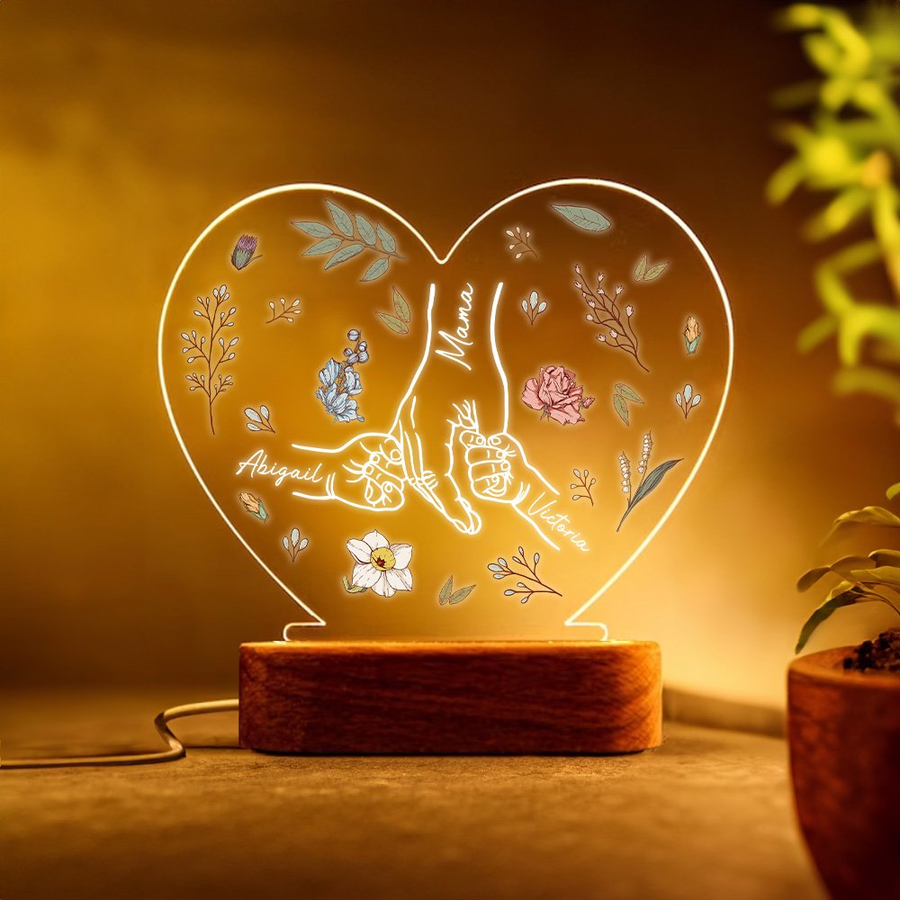 With the image of a small hand holding a larger one it symbolizes the nurturing bond shared in a family. This night light can be personalized with up to 6 names, each represented by a birth flower. Every flower corresponds to a birth month, adding both beauty and symbolic value to the design.