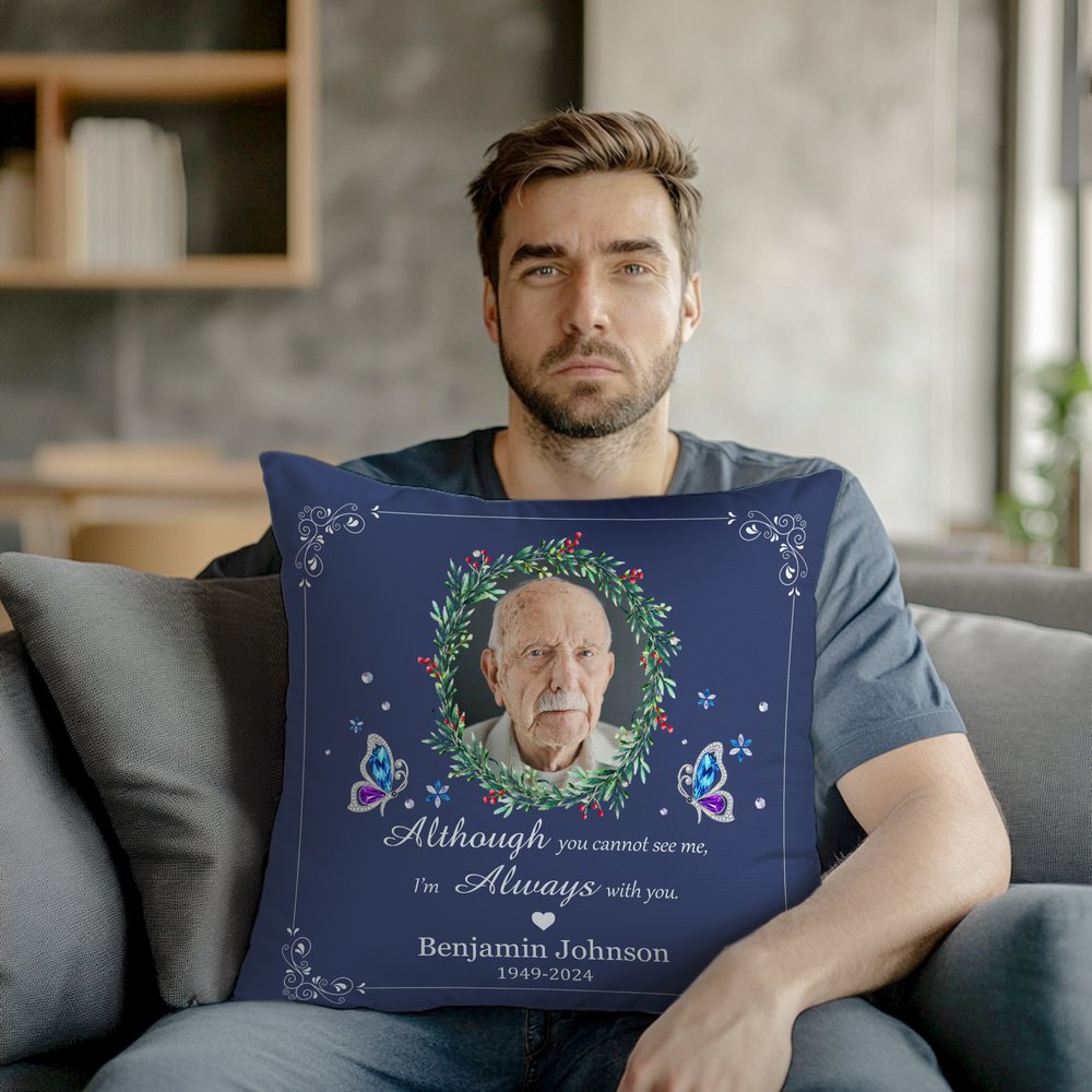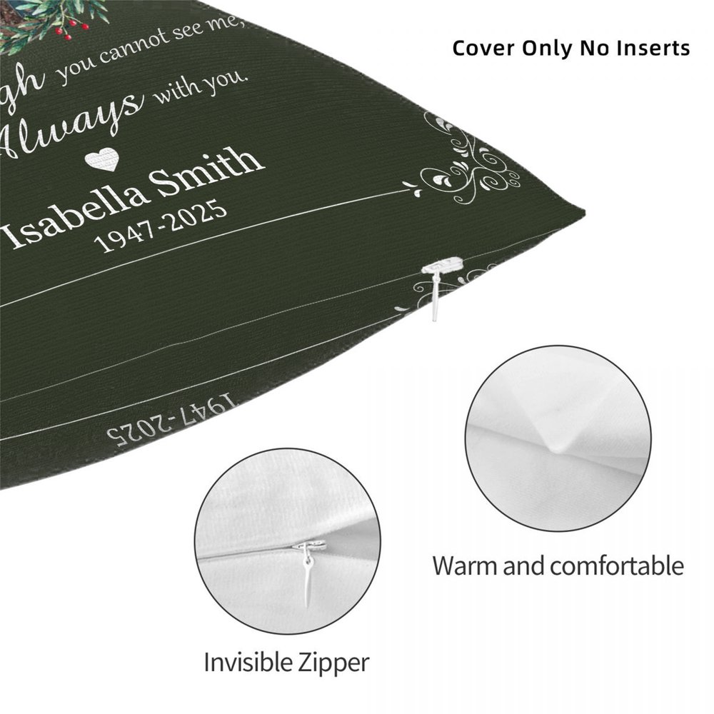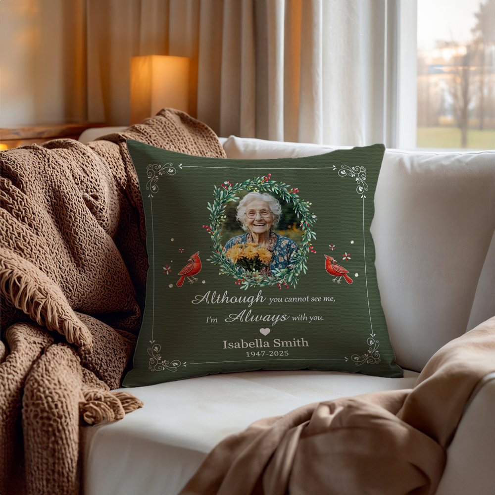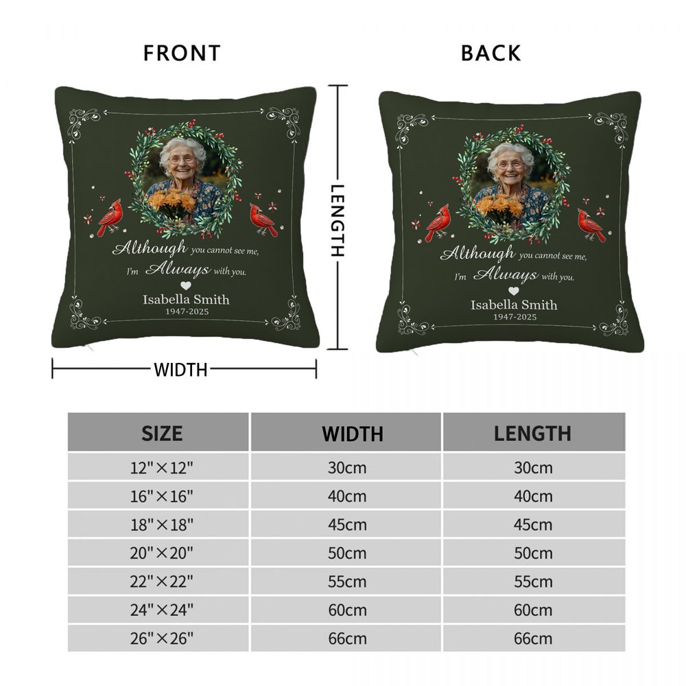 This throw pillow cover features a distinctive design, with a face photo at its center encompassed by a holly border, adding a touch of solemnity. Elements such as cardinal birds, butterflies, dragonflies, and owls are thoughtfully integrated into the design, conveying deep meaning while remaining lively and vibrant. The name and year are clearly marked, giving the memory a personalized touch.