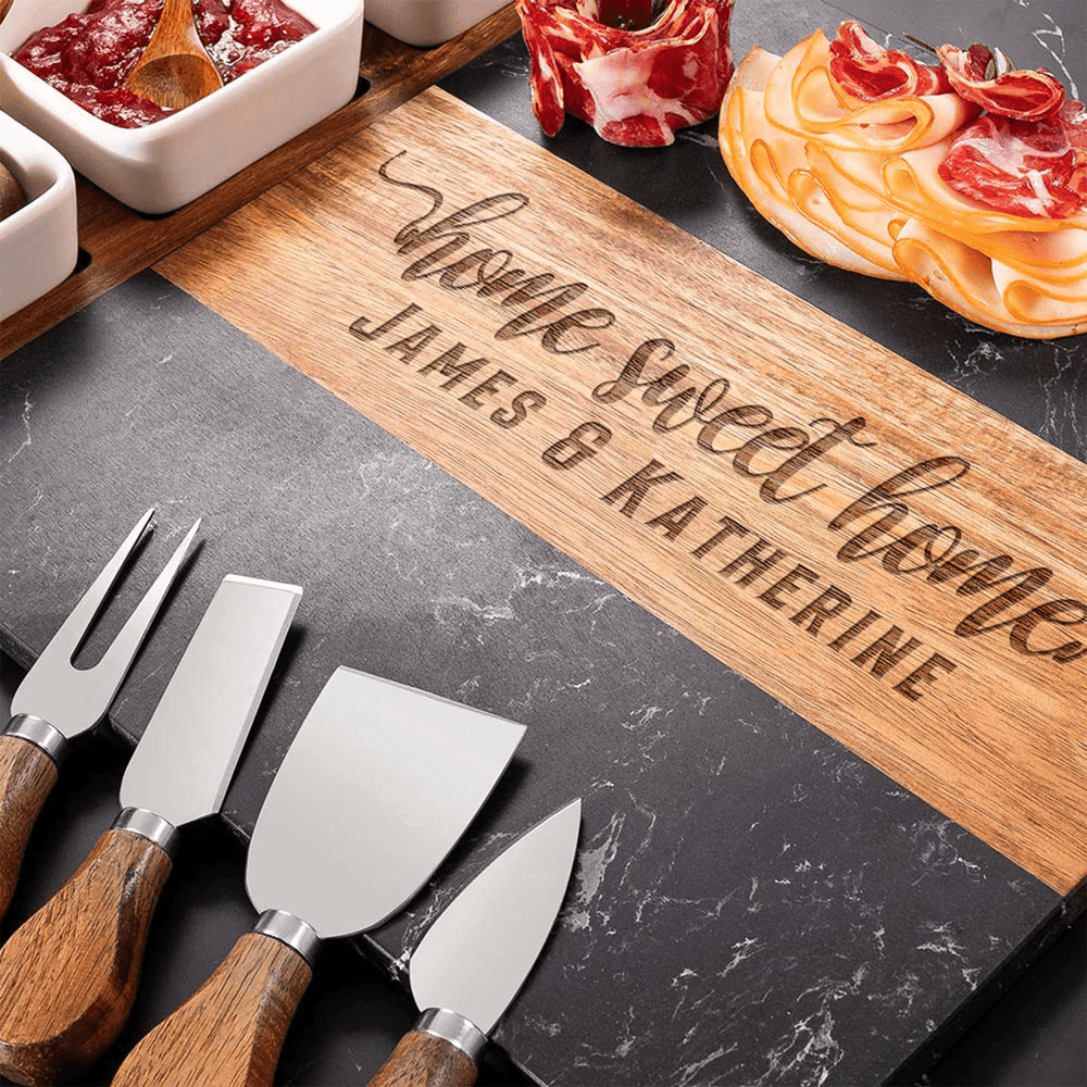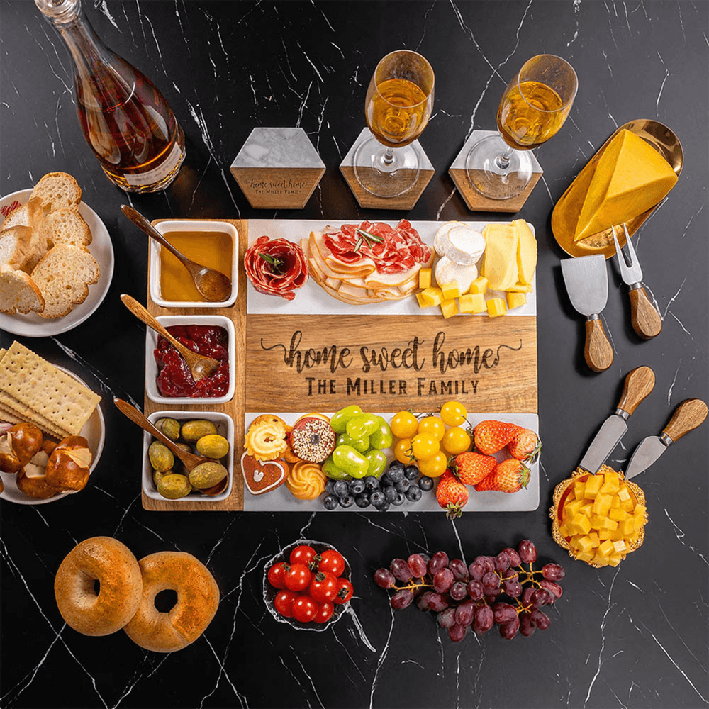 Crafted with premium marble and acacia wood, and featuring the fixed "Home Sweet Home" text, this set also supports personalized name customization. The overall design is unique and exquisite, combining durability with elegance, giving it a distinctive and luxurious feel.