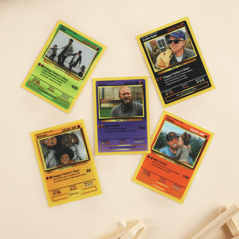 Based on the classic TCG poke card template, this card features customizable images and personalized blessing messages. The layout is meticulously designed, seamlessly integrating the father's name, anniversary, and heartfelt sentiments to create a one-of-a-kind collector's item.