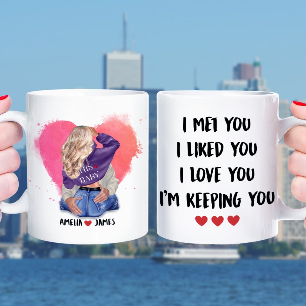 Our couple coffee mug is designed to show your love for your partner, printed with a sentimental quote" I Met You I Liked You I Love You I'm Keeping You", you are allowed to customize the names of your and your loved ones.
