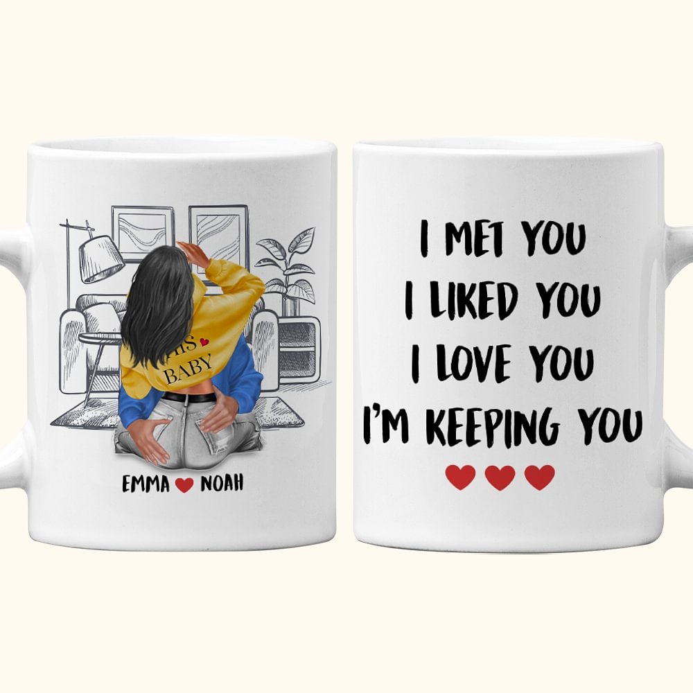 Our couple coffee mug is designed to show your love for your partner, printed with a sentimental quote" I Met You I Liked You I Love You I'm Keeping You", you are allowed to customize the names of your and your loved ones.