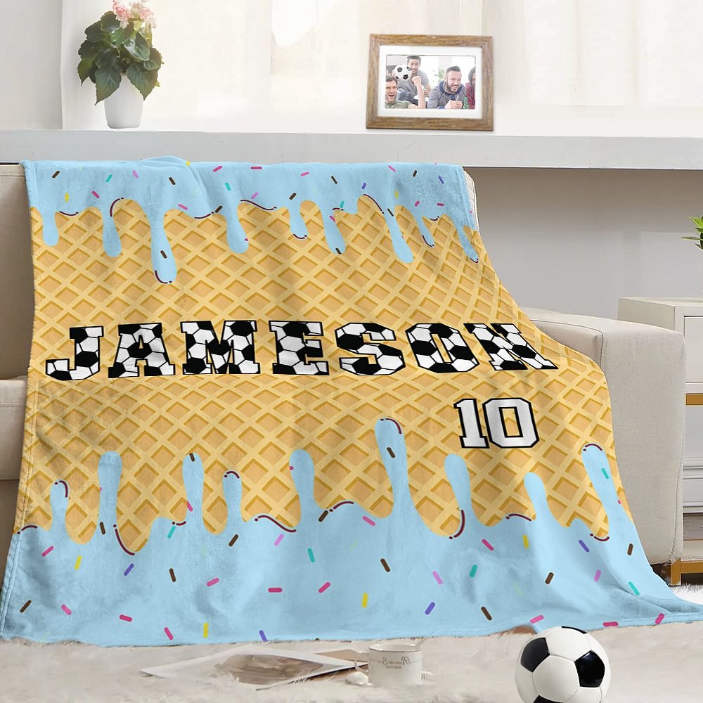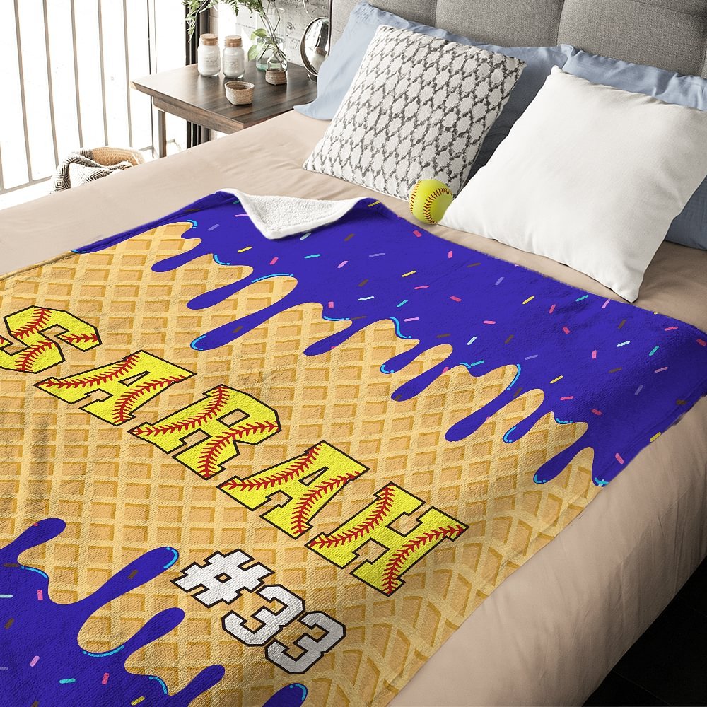 This soft blanket fully demonstrates the passion and personality of ball sports. The ice cream background design is very suitable for summer. It is bright and colorful. The middle is a striking name customization, and the font has added baseball, softball, or football design. You can also add your number, making it not only a practical item but also a personalized home decoration.