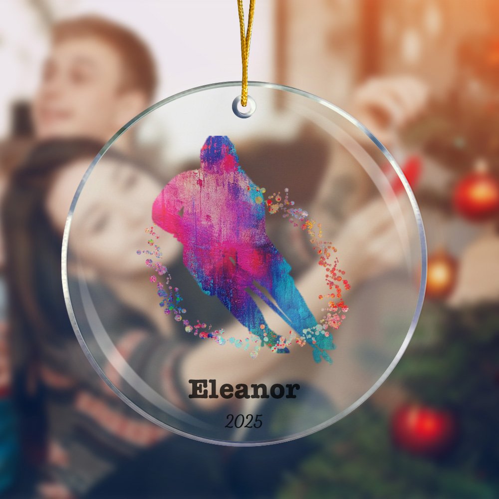 This ornament features an ice hockey player silhouette paired with soft watercolor hues, creating an elegant and modern item. The personalization option allows you to add a name, making it a truly one-of-a-kind keepsake perfect for any ice hockey player and lover.