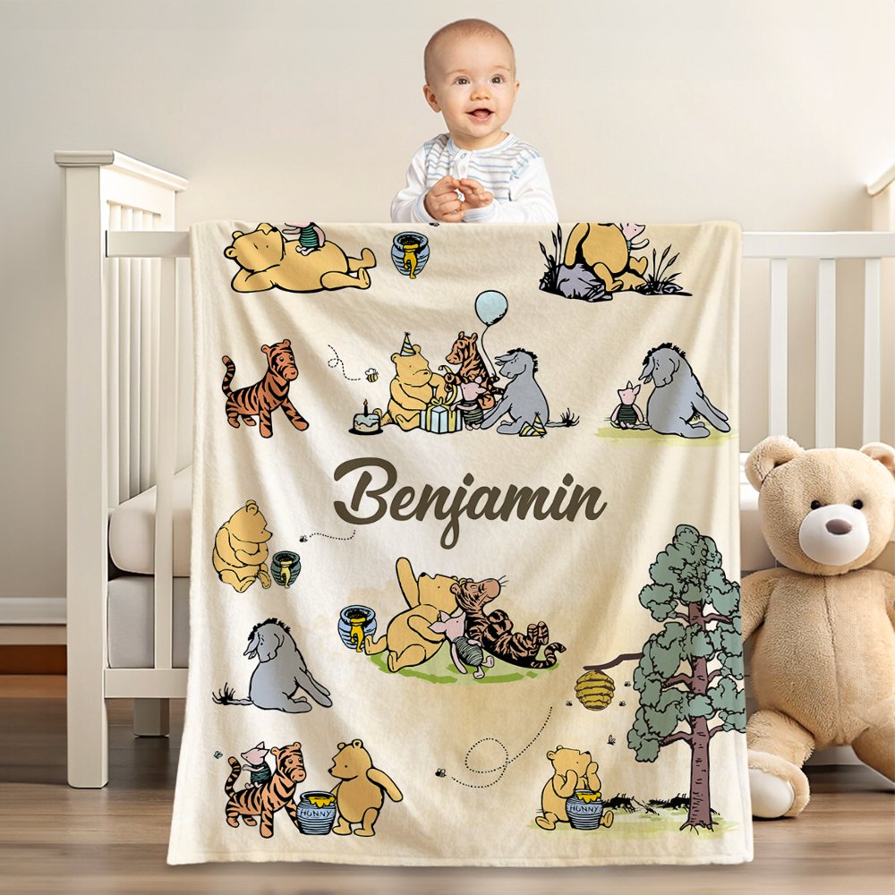 This blanket with the original classic Winnie the Pooh created by the renowned author A. A. Milne is a warm and thoughtful exclusive gift! The blanket adopts the classic Winnie the Pooh design, with soft tones and cute illustrations, adding a childlike touch to children's rest time. It supports customized children's names, and exclusive printing makes the blanket more personalized and commemorative.