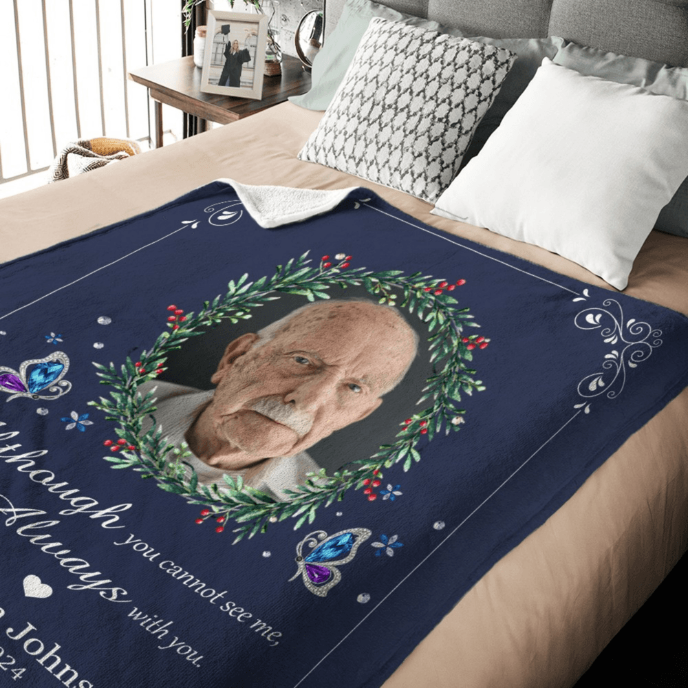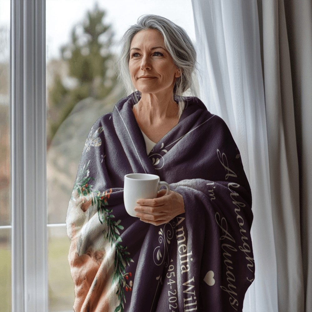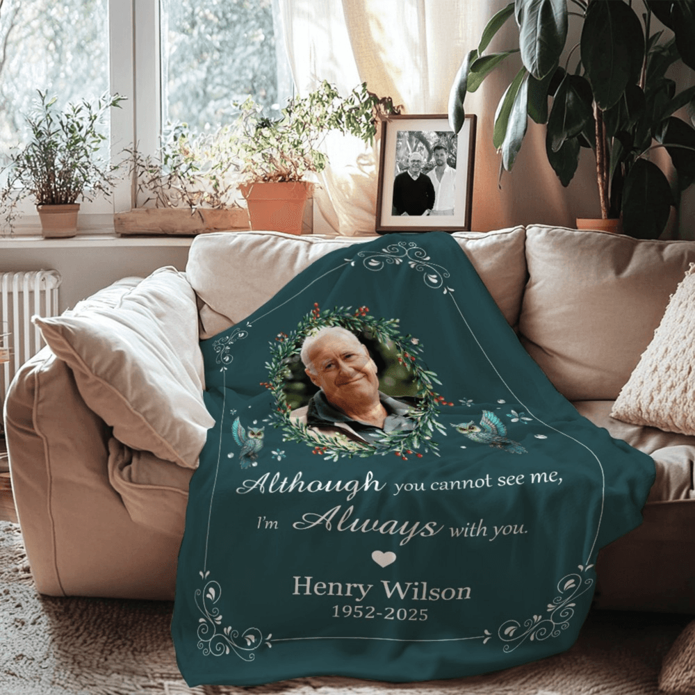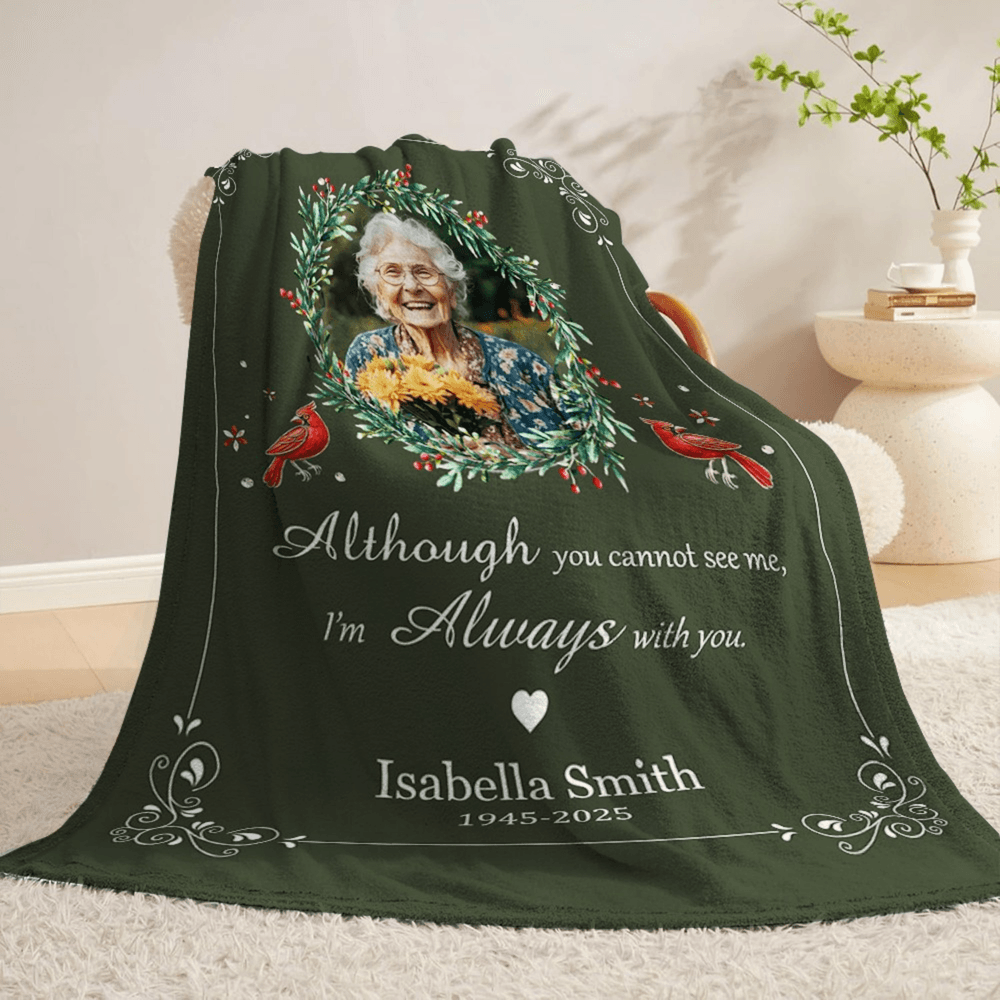 This commemorative blanket is designed around cherished memories. You can upload a treasured photo, which is beautifully framed with a wreath and adorned with decorative elements like cardinals and owls, creating a warm and comforting atmosphere. The blanket can be personalized with a name and dates of birth and passing, accompanied by the meaningful message: “Although you cannot see me, I’m always with you.” This transforms longing into a tangible, warm keepsake that balances aesthetic beauty with deeply personal significance.