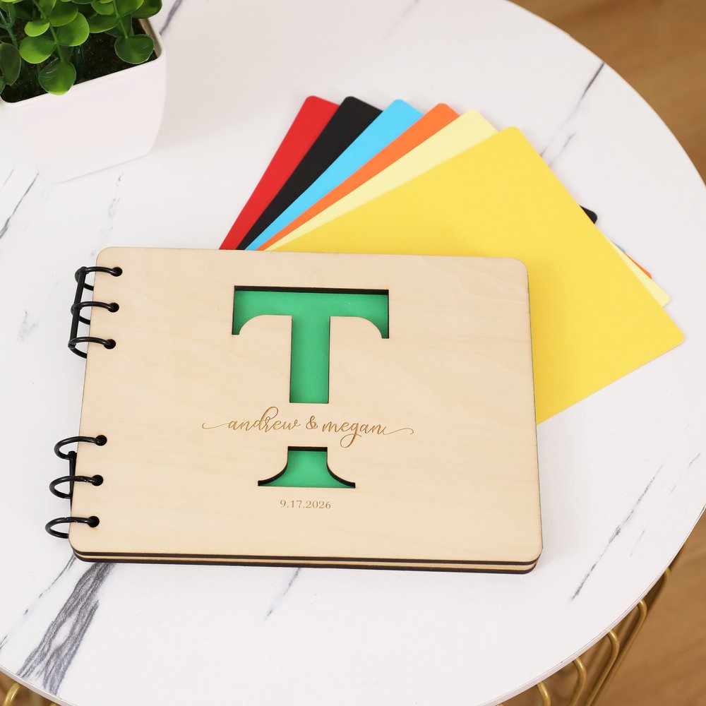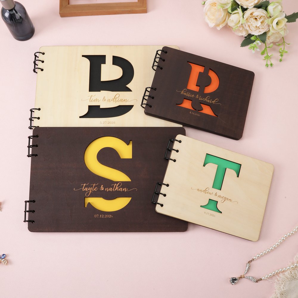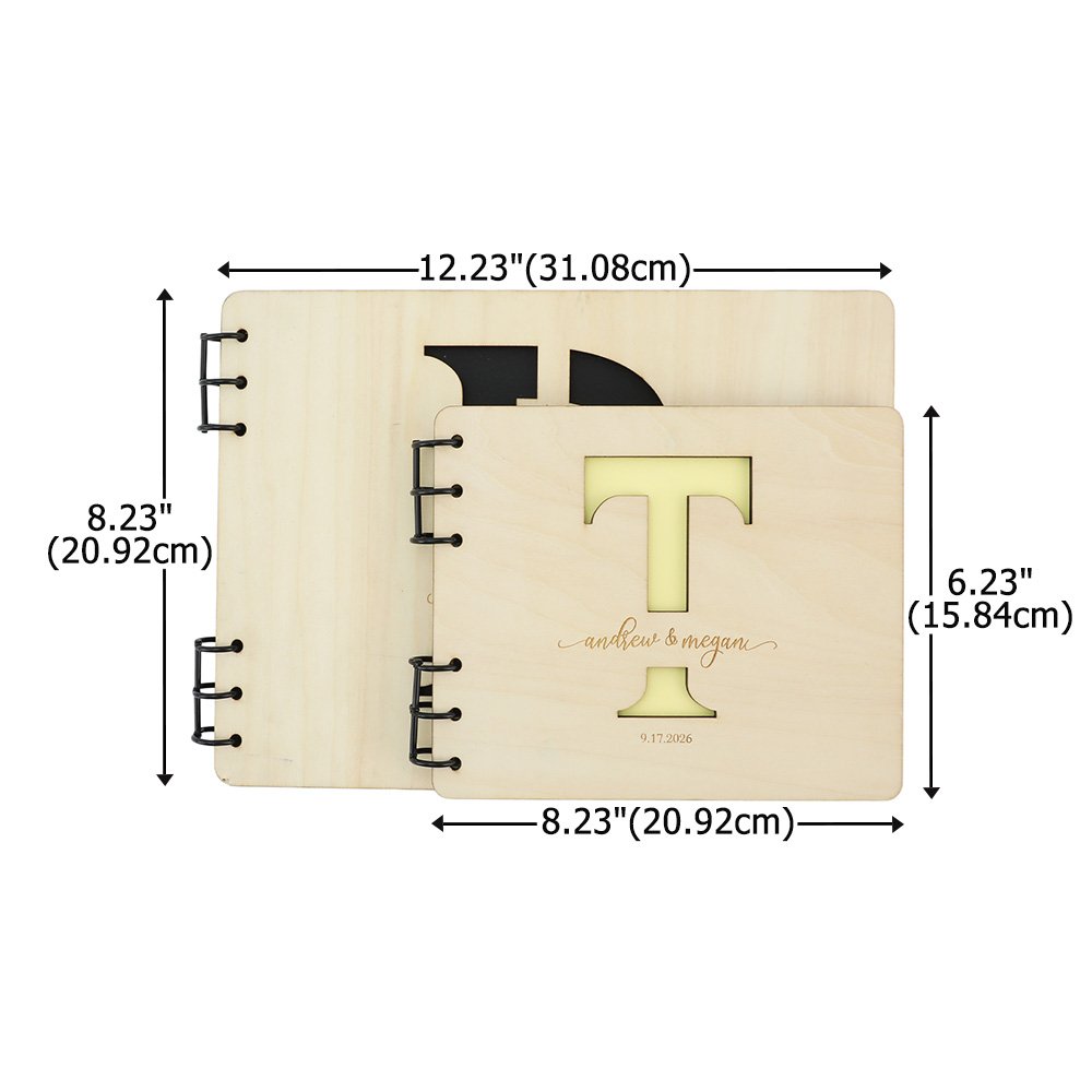 This wooden wedding guest book, engraved with the couple’s names, is an essential ceremonial piece for modern weddings, exuding a fresh, rustic charm. Its distinctive cutout letter design, personalized with the couple’s names and wedding date, transforms the traditional guest book into a romantic, bespoke keepsake, infusing every detail with elegance and meaning.