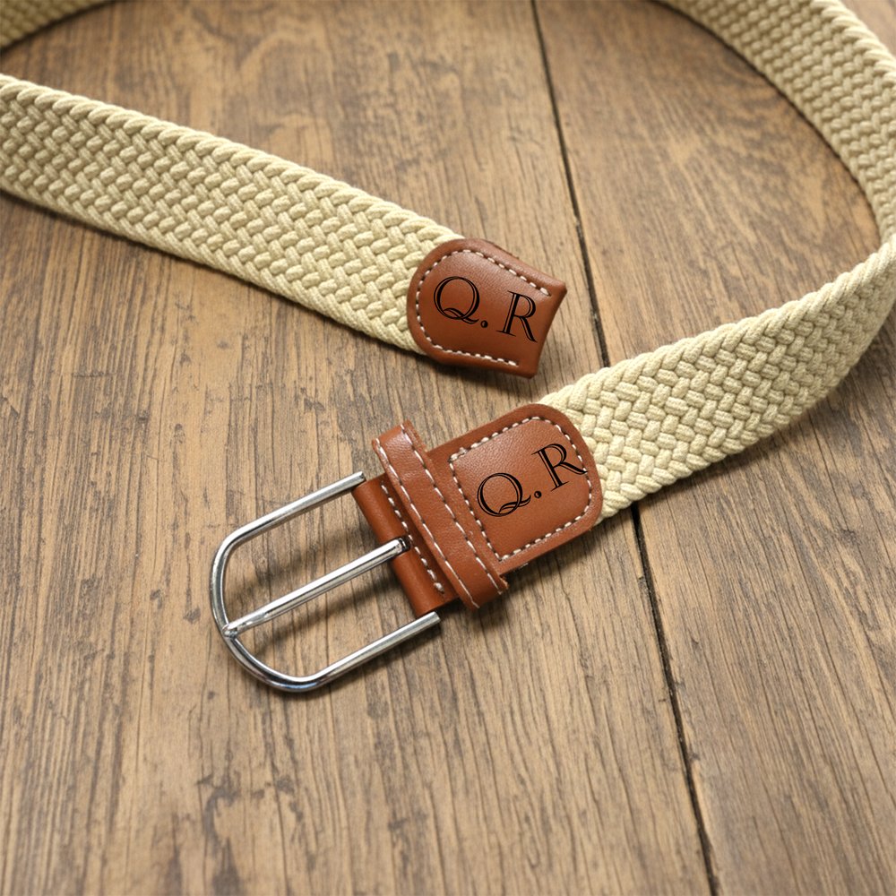 This casual belt features customizable fancy initials or names on the PU leather details head and tail. Made with elastic woven rope, it offers a unique blend of subtlety and personalization, making it a distinctive accessory that showcases individual style.