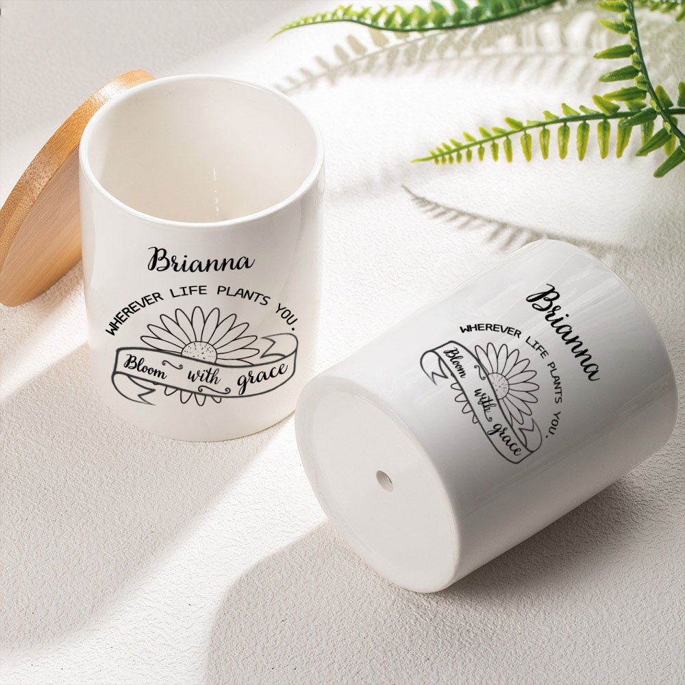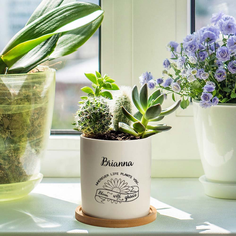 The plant pot features the uplifting phrase "Wherever life plants you, bloom with grace," beautifully complemented by intricate floral patterns. The option to customize the pot with the teacher's name adds a personal touch, transforming it into a unique keepsake.