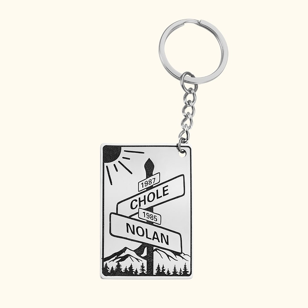 •The road signs keychains have the meaning that two people come from different directions, meet together at the intersection of love at a certain point, and experience everything together on the same road until now and in the future.