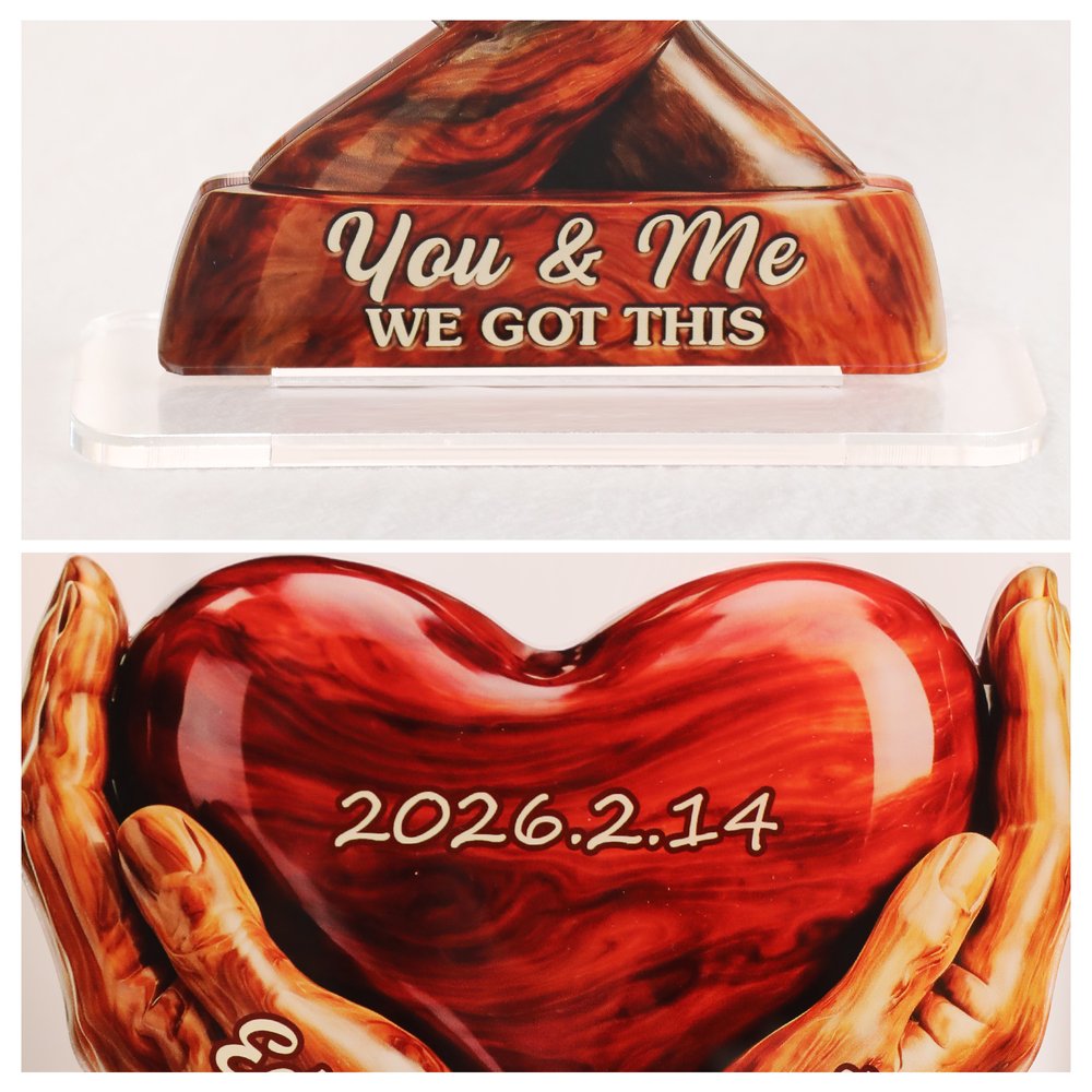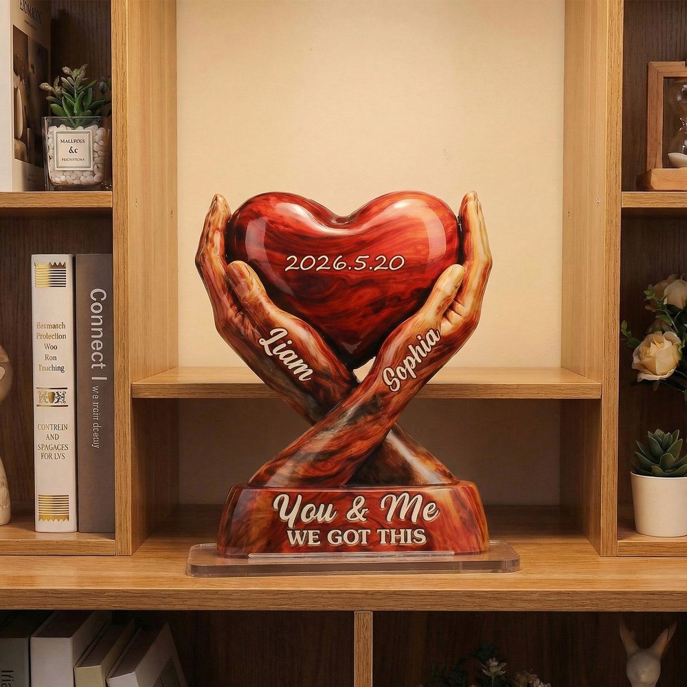 This heartfelt acrylic keepsake offers deeply personal customization to celebrate a couple’s unique love story. You can add both partners’ names to the intertwined hands, a special anniversary or memorable date to the central heart, and keep the iconic “You & Me WE GOT THIS” message on the base.