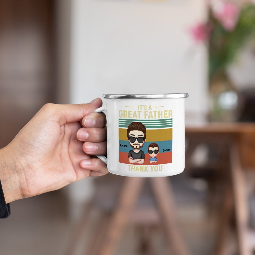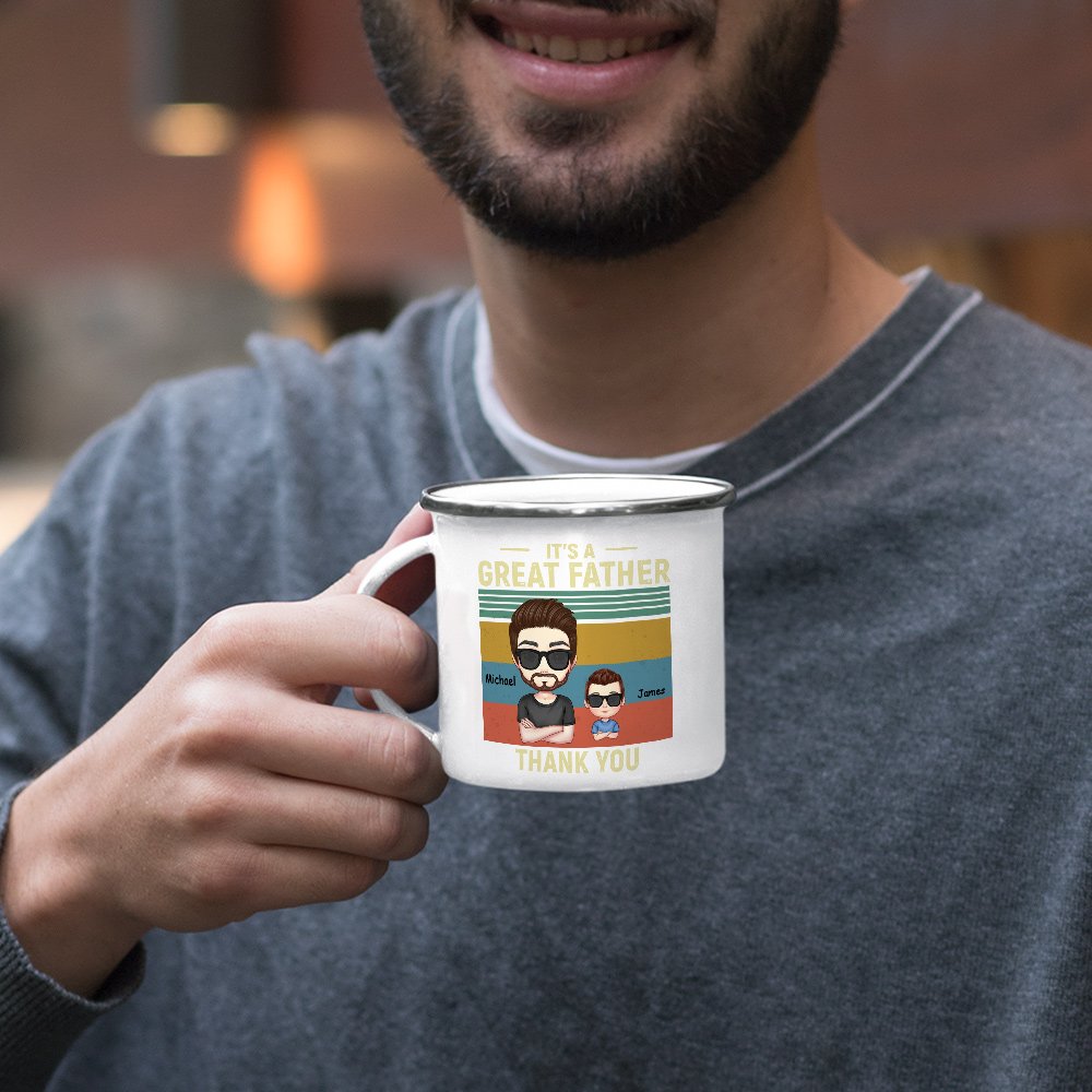 Crafted from high-quality enamel, this mug is built to withstand daily use and features a smooth finish that is easy to clean. The "It's A Great Father Thank You" design is carefully printed onto the surface of the mug with precision and attention to detail, ensuring that it will not fade or peel over time.
