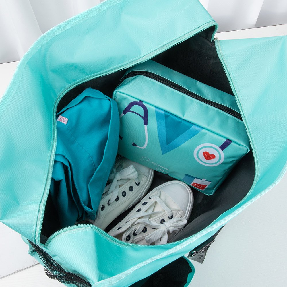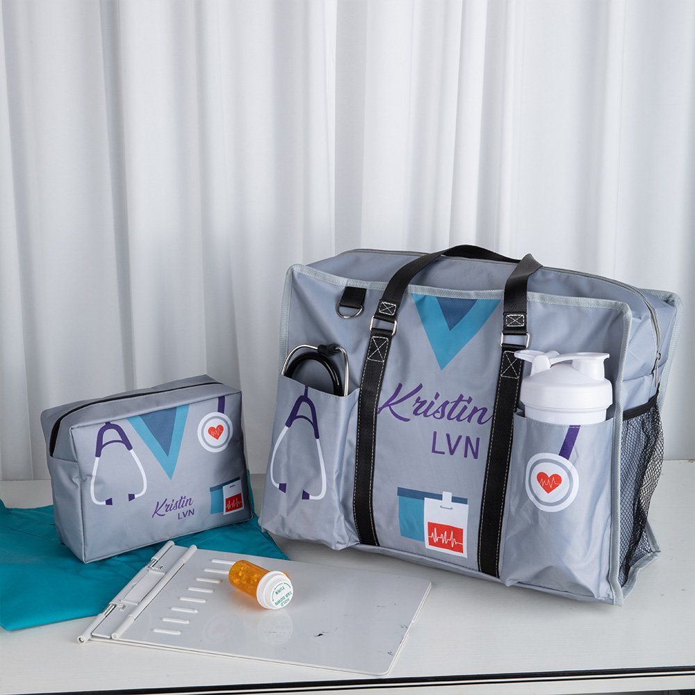 This is a practical nurse tote bag, we provide with large bags, small bags, and sets, which can greatly meet your different store needs. The bags are available in four colors: pink, green, blue, and gray. The stethoscope, electrocardiogram, and other elements on the bag can arouse the resonance of medical staff. Therefore, it is an ideal gift for healthcare workers.