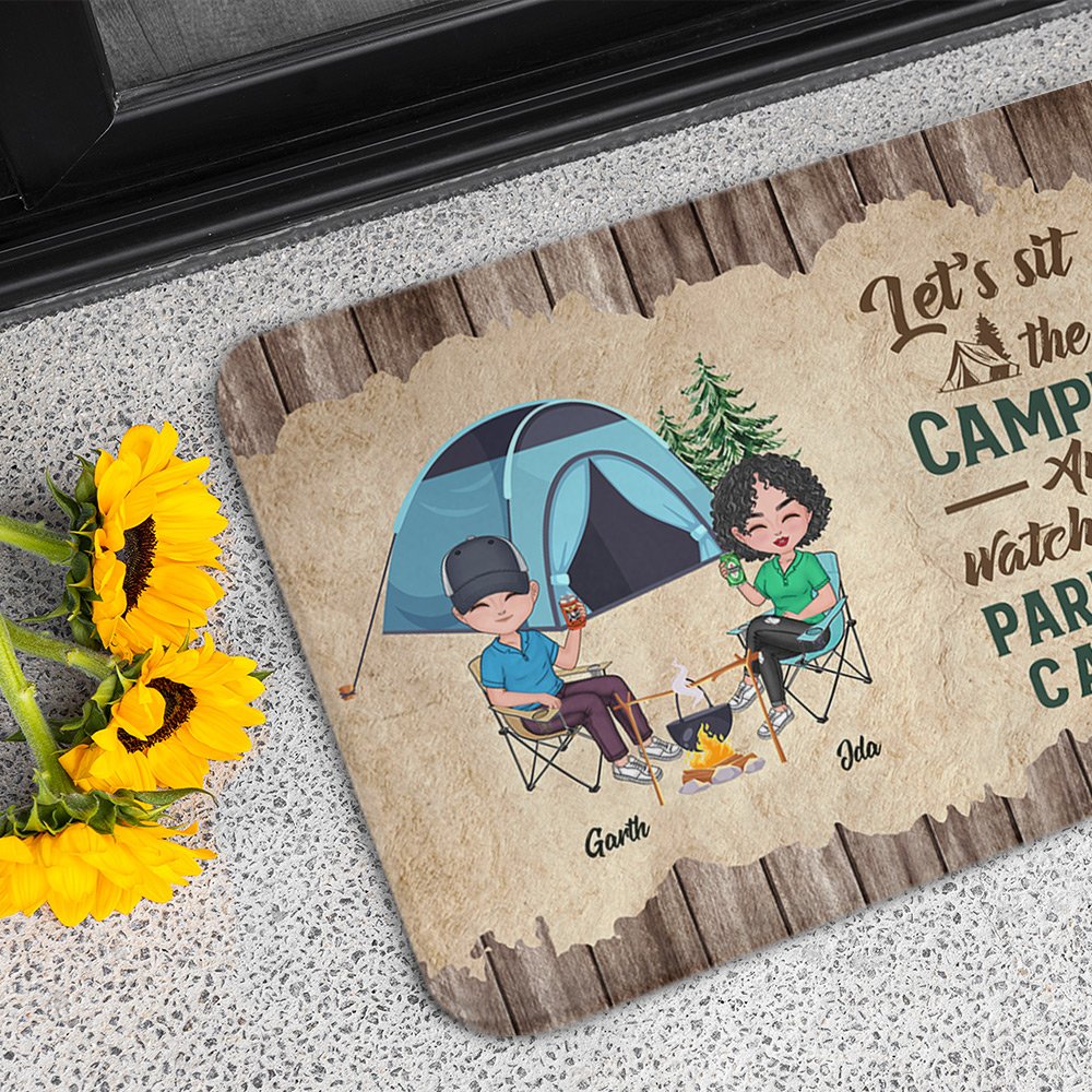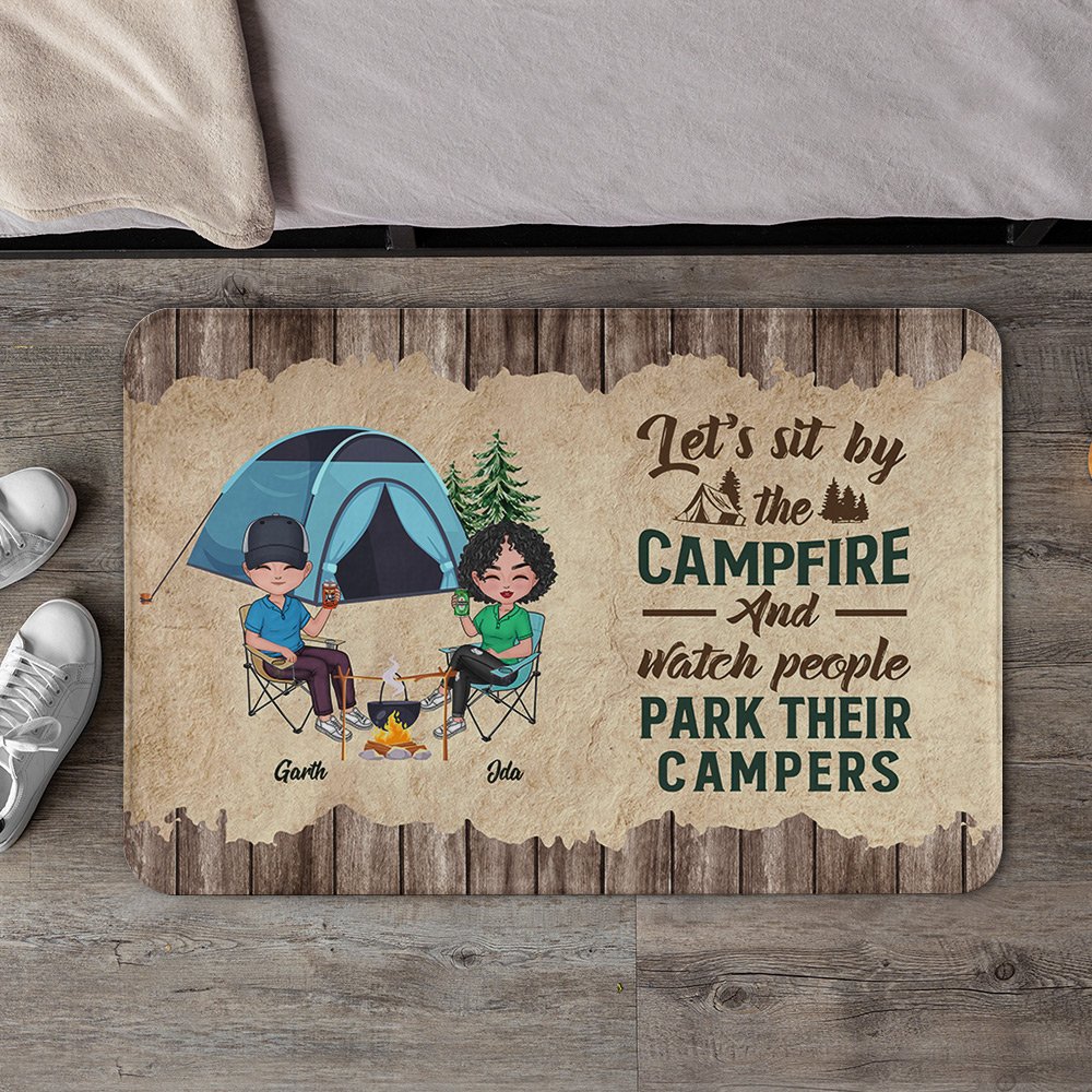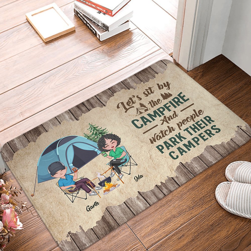 The message "Let's Sit by the Campfire and Watch People Park Their Campers" is beautifully printed on the doormat, reminding the couple of their everlasting love and the adventures they have shared.