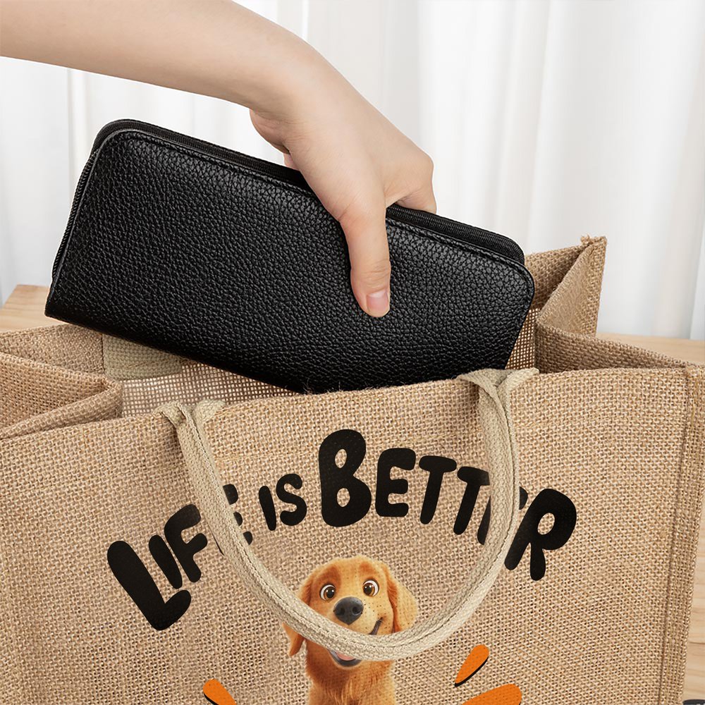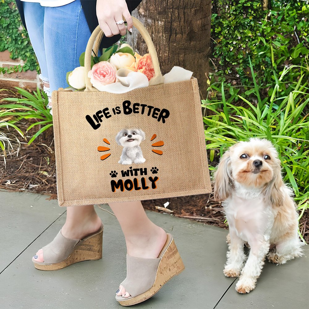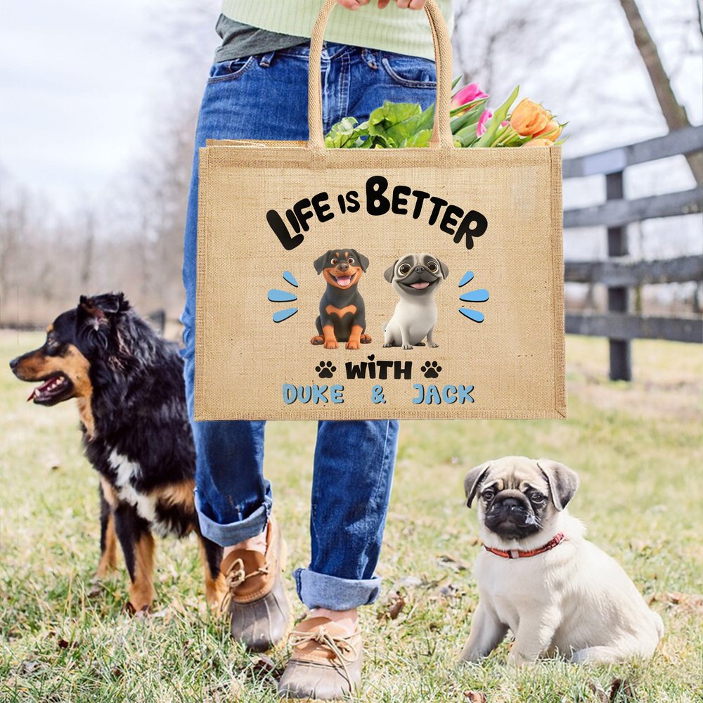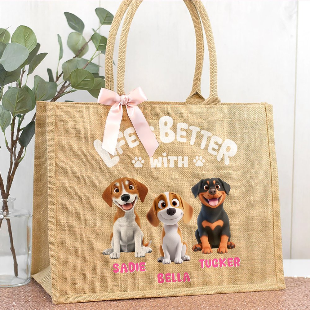 This "Life is Better" tote bag perfectly blends style and sentiment. It features a cartoon dog print, adorable pet-themed text, and customizable names—perfect for dog lovers. The design captures the warmth of furry friendships, transforming an everyday bag into a personalized keepsake filled with happy memories.