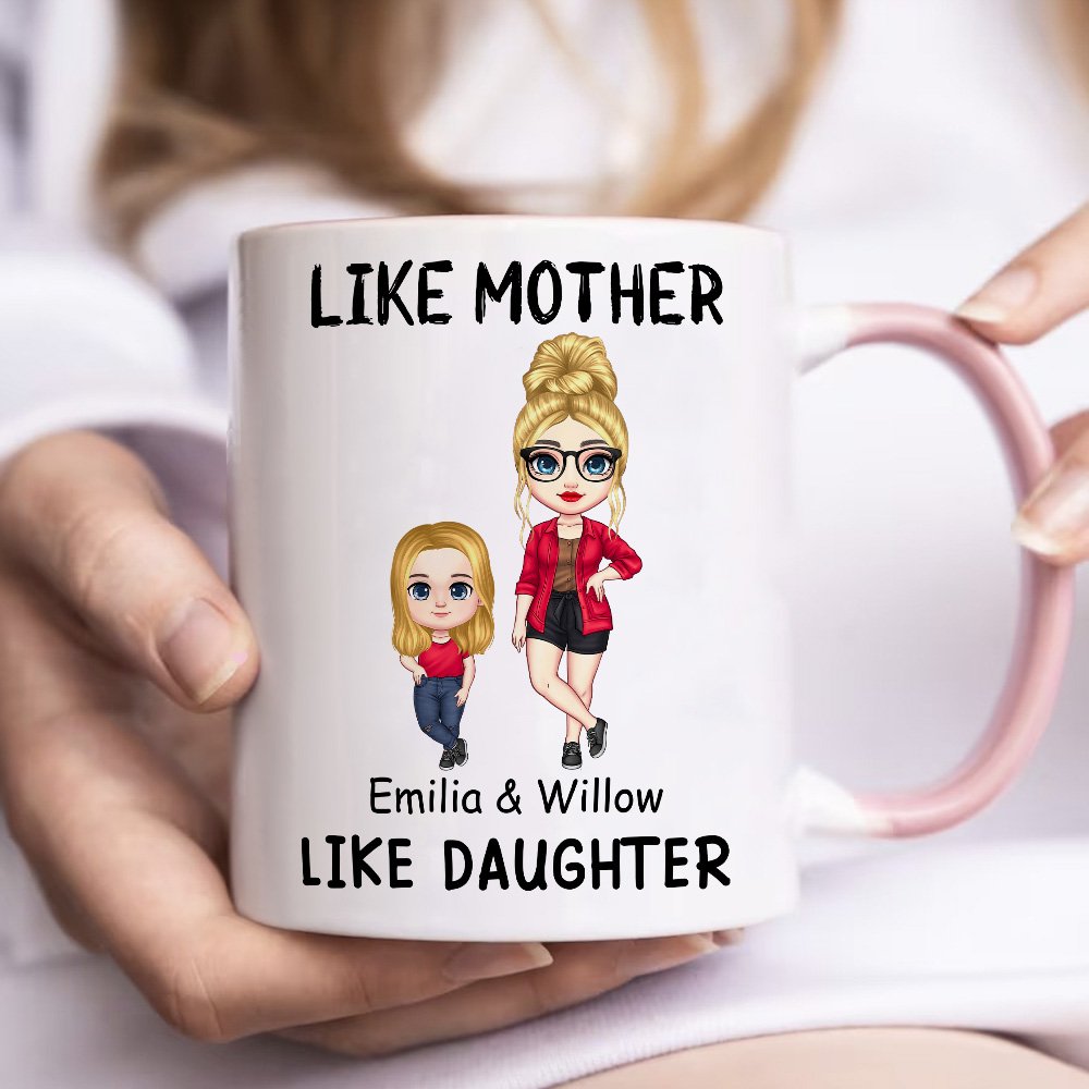 Our ceramic mugs are designed with a heartwarming, two-sided cartoon illustration of a mother and daughter, allowing you to fully customize their appearance with different skin tones, hairstyles, and outfits. The fixed text "LIKE MOTHER" and "LIKE DAUGHTER" beautifully symbolizes the close bond between a mother and her daughter. What makes this mug truly special is the ability to add the names of the mother and daughter, making it a unique and meaningful keepsake.
