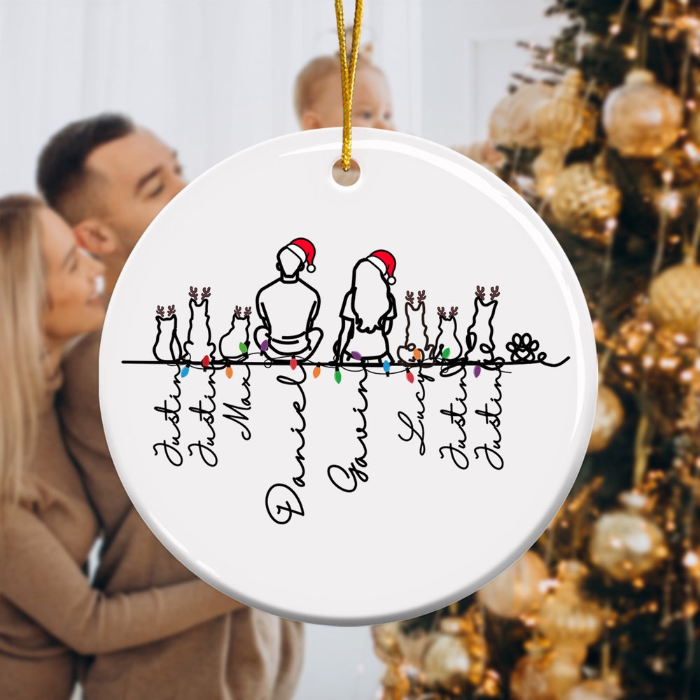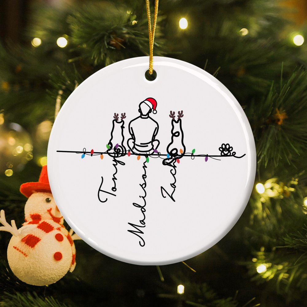 This ornament features a minimalist line art style, showcasing the figure of a person alongside their beloved pet, all set against a backdrop of vibrant holiday lights. The flowing lines create a unique silhouette that conveys warmth and the intimate bond of family. Each piece can be customized with names and pet images, transforming it from a mere decoration into a heartfelt, personalized work of art.