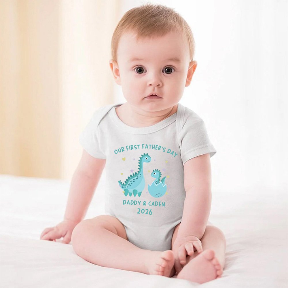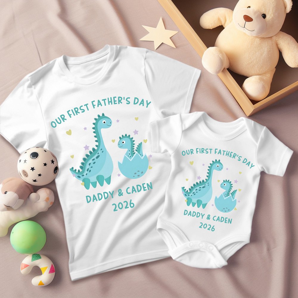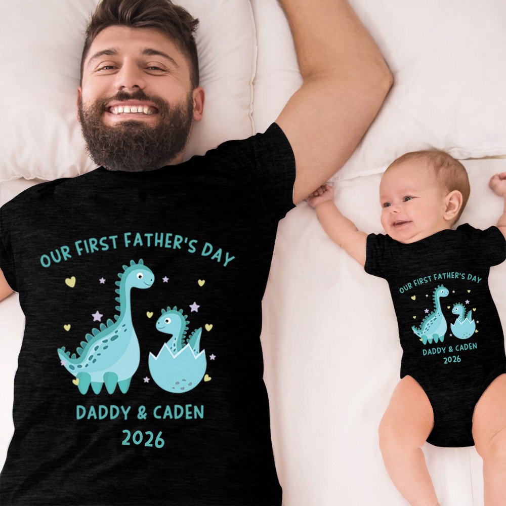 Our personalized set is the perfect way to celebrate Father's Day with your little one! This matching set of shirts is made from high-quality, soft cotton that is both comfortable and durable. The design features a cute little dinosaur, complete with personalization options so you can add your baby's name and birthdate for an extra special touch.