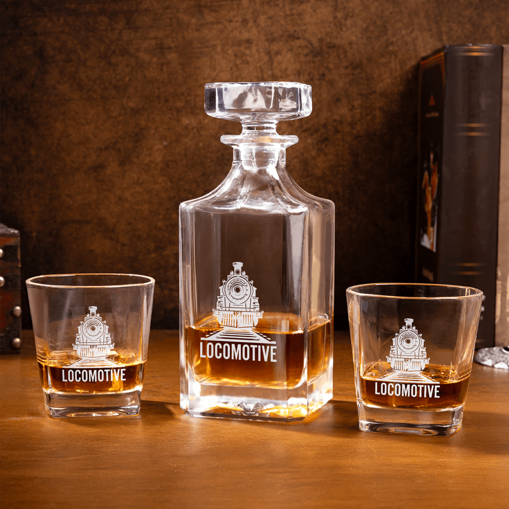 With locomotive elements as its core design highlight, this set perfectly blends personal expression with practicality. Custom engraving is available on the high-quality glass decanter and exquisite wooden box, making each set unique.