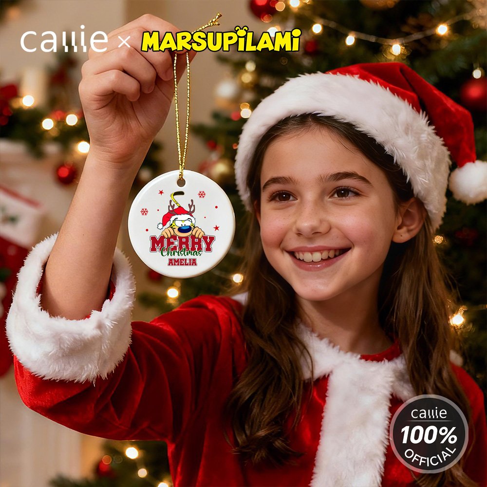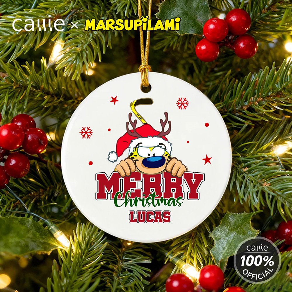 Inspired by the jungle-dwelling creature Marsupilami—known for its yellow fur, black spots, and incredibly flexible, long tail—this ornament carries the warm greeting “Merry Christmas,” paired with festive elements such as Santa hats and reindeer antlers, creating a lively and festive atmosphere that adds playful charm to your holiday decor.