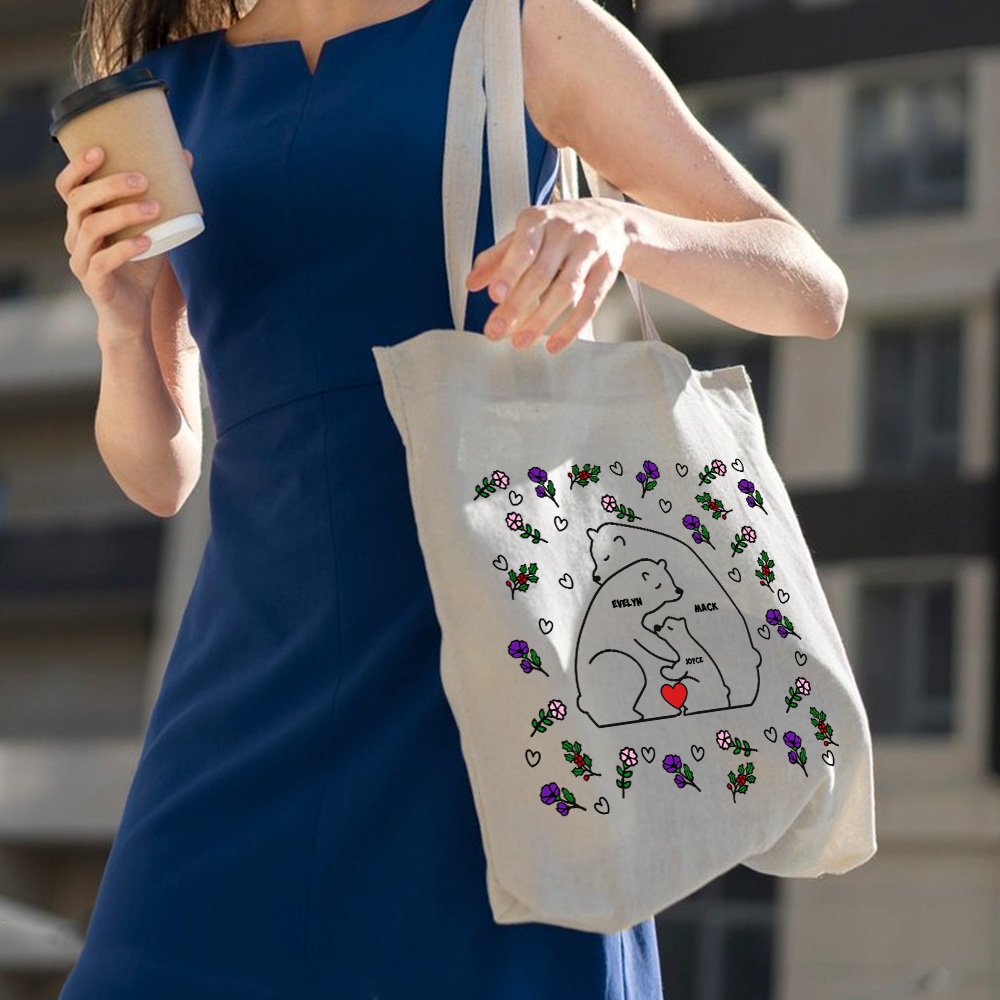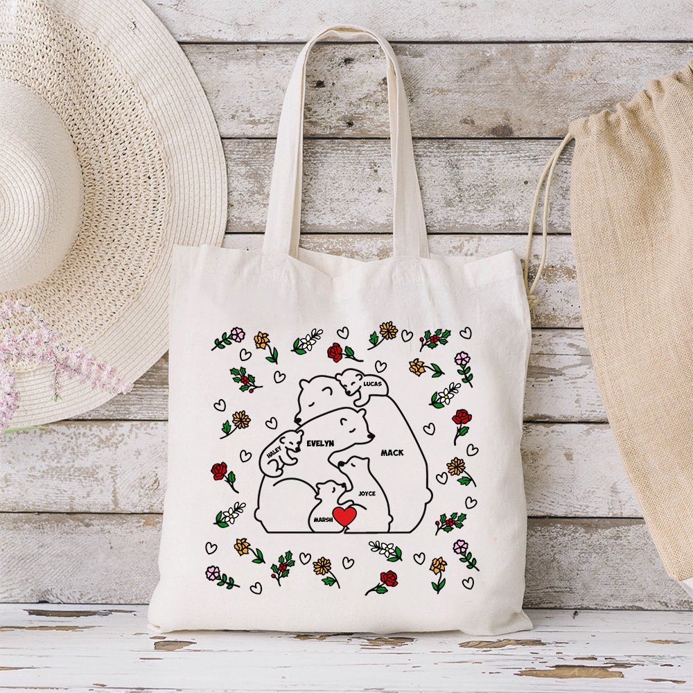 This tote bag features a family of bears hugging each other, surrounded by flowers and hearts, symbolizing a loving family. You can customize 2-9 bears, each with a name and corresponding birthday flowers to remind you that love and support keep your family together in good times and bad.