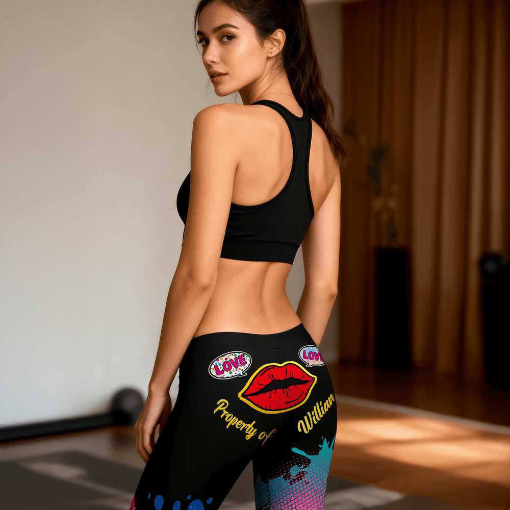 Featuring a bold red lip print and a "LOVE" themed speech bubble as core elements, these yoga pant combines a sweet and cool street graffiti style for an eye-catching visual effect. Customization with your name is supported, enhancing uniqueness and intimacy, transforming the yoga pants into a stylish accessory that blends romance and individuality.