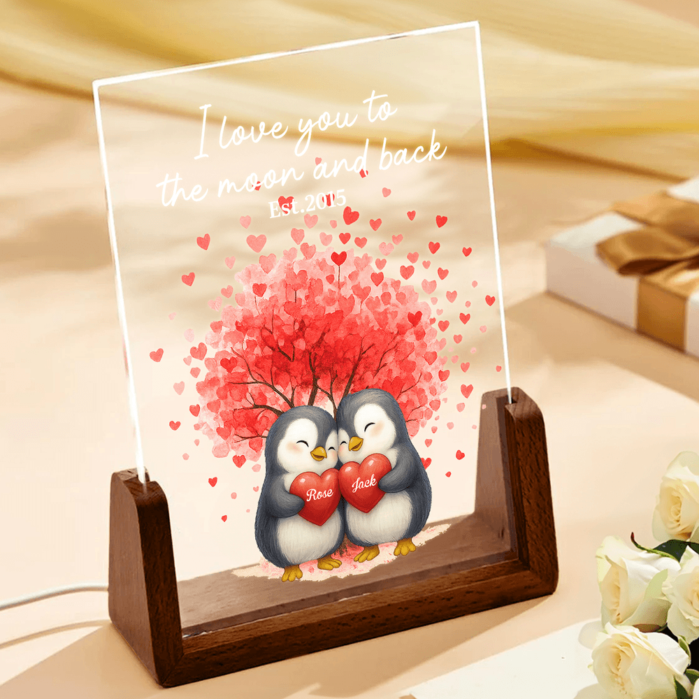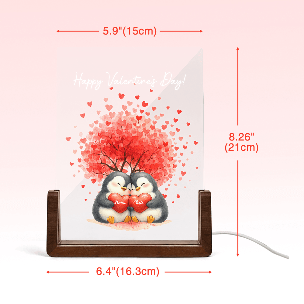 Personalized Love Tree Cute Penguin Acrylic LED Night Light with Name Date and Wooden Base Home Decor Valentine's Day Anniversary Gift for Couples