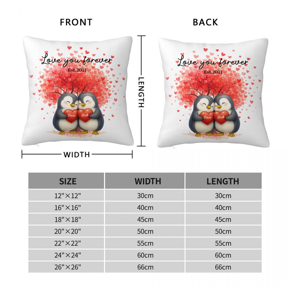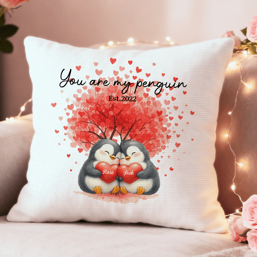 This pillow features a pair of lovingly intertwined penguins as the central motif, accompanied by a charming love tree and heart-shaped patterns, creating a warm and romantic scene. Two adorable penguin poses are available for selection, adding a playful and sweet touch. You can also personalize it with names and custom text, making it a one-of-a-kind commemorative gift that carries your unique affection in every detail.