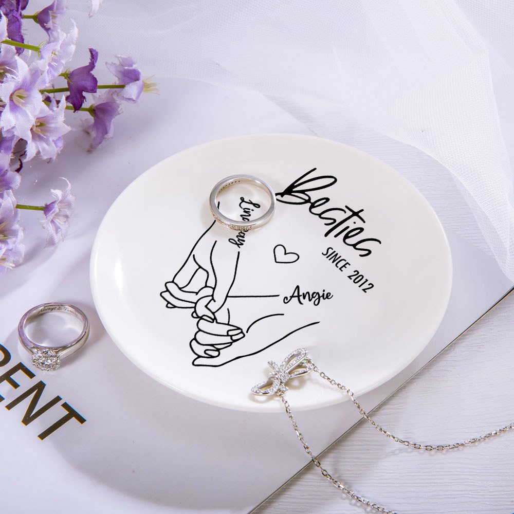 A personalized jewelry tray gift for a best friend with a love heart and a pretty design. There are gestures expressing love for your besties printed on it, and you can customize the names of you and your girlfriend. Different styles have different customization options, two of which are printed with "love you", and the other two can customize the date you met your besties. Express your feelings and attention to your besties, act now!