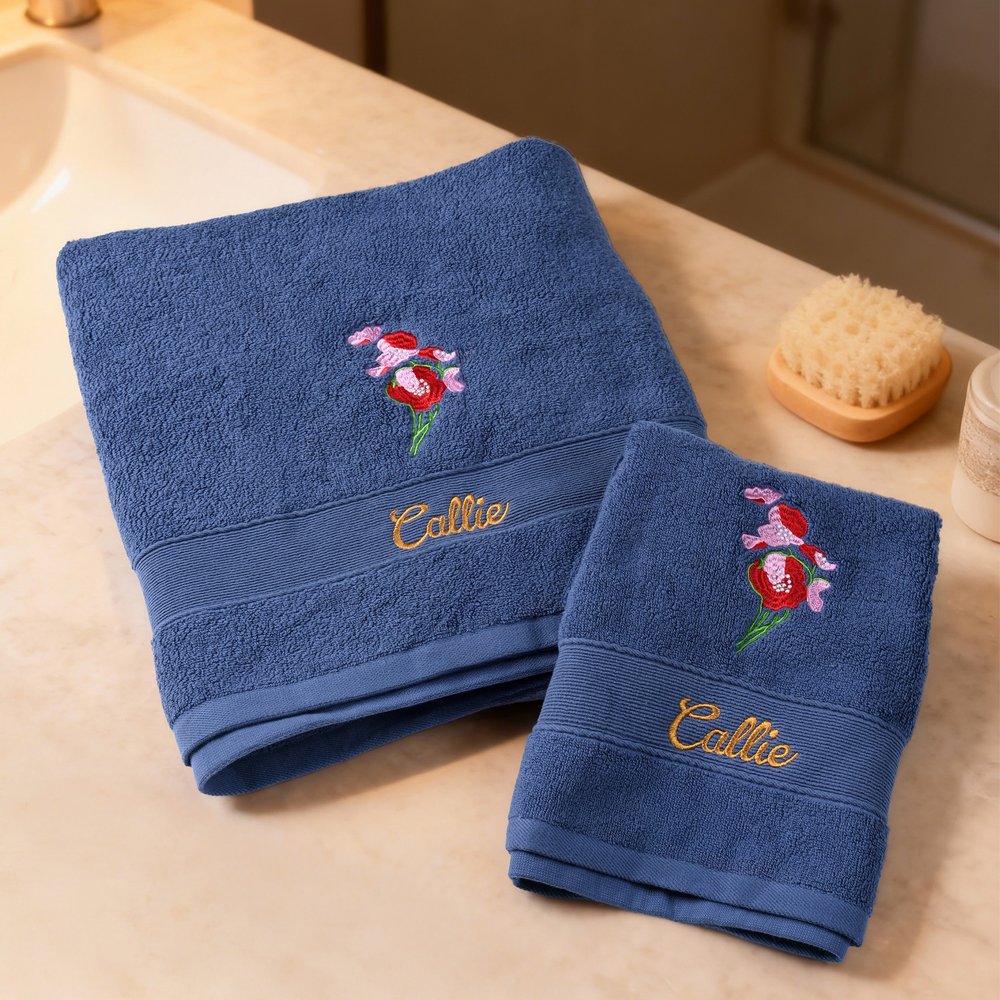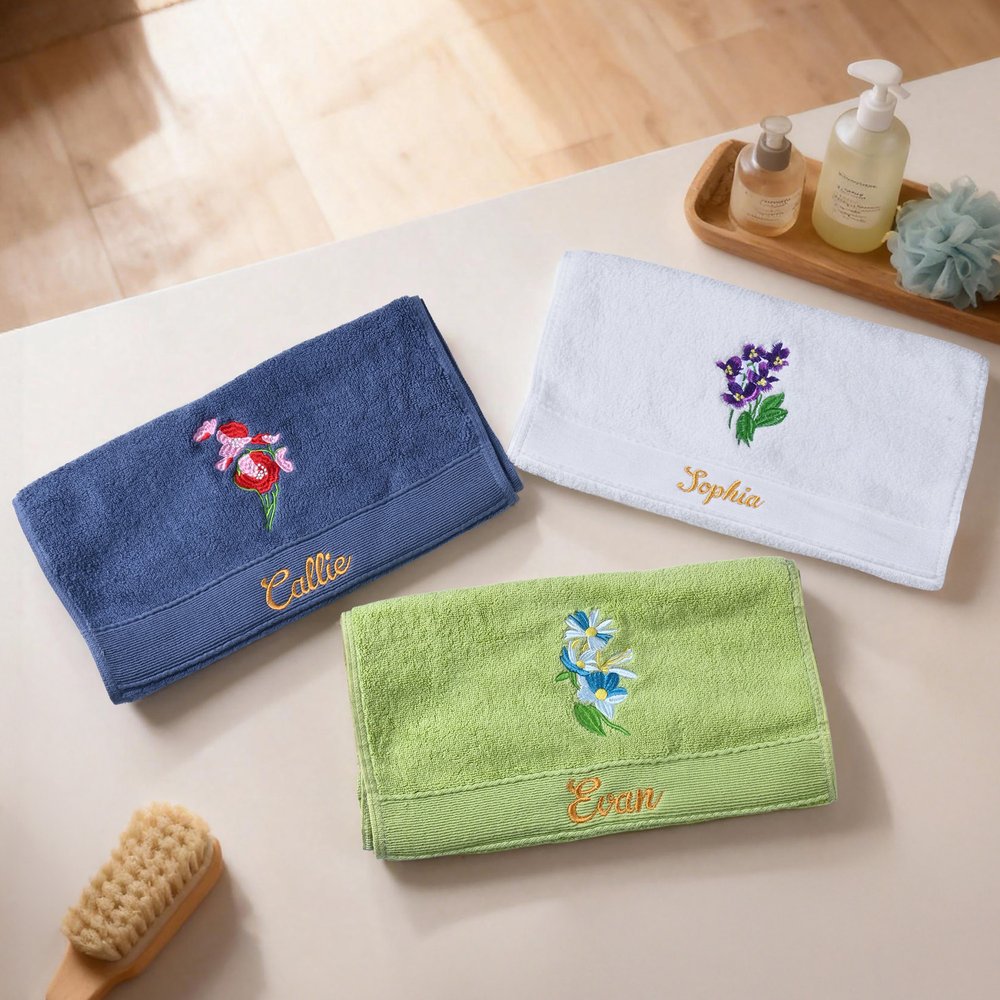 This soft 100% cotton towel features a beautifully embroidered birth flower and can be personalized with a name, making it a truly unique and meaningful gift.