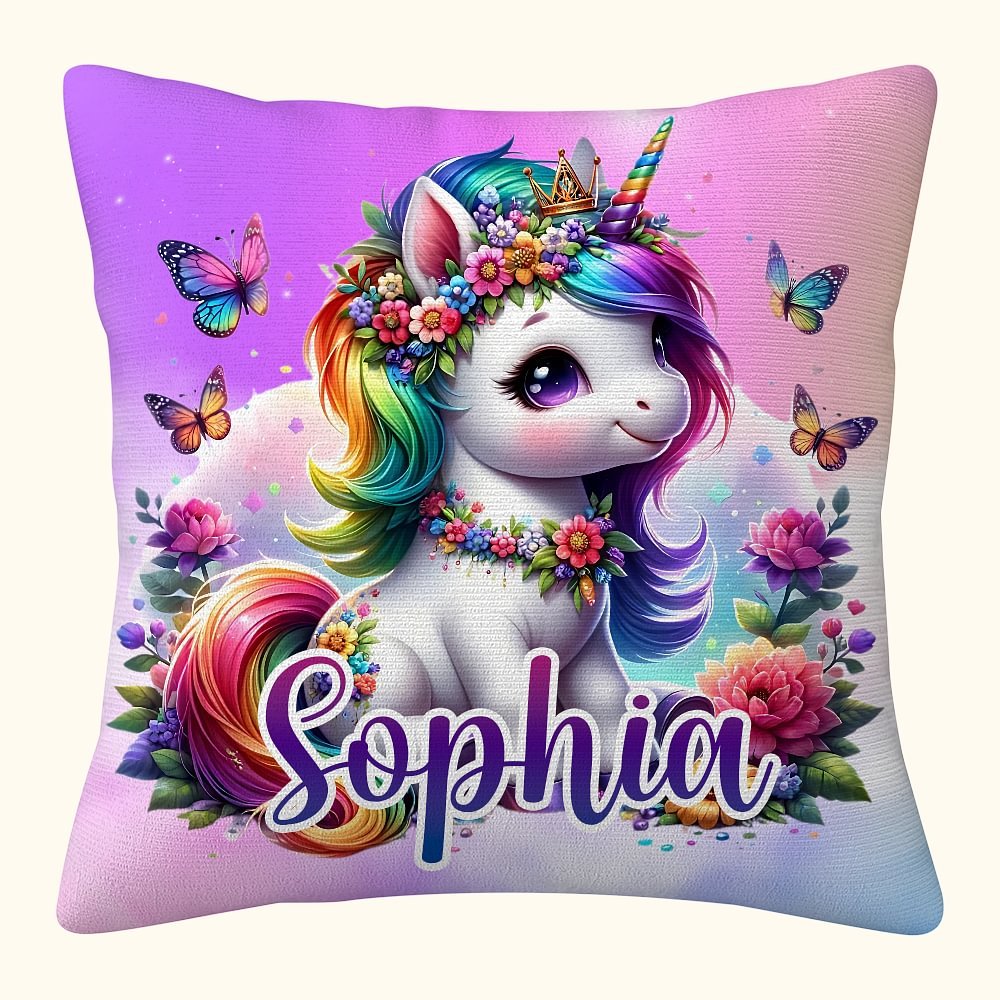 This throw pillow cover features cute unicorns. Each unicorn has a unique shape, matched by a gorgeous rainbow background and various floral and butterfly elements. The design is full of fairy tale colors, adding a dreamy feeling to the overall design.