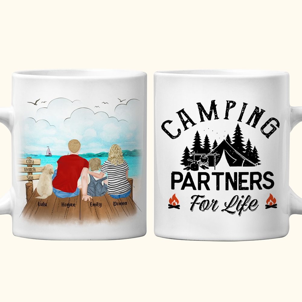 The mugs are imprinted with the words "Camping Partners for Life" with a heartwarming image of the family in the great outdoors. You can get a one-of-a-kind mug by customizing the character's outfit and your furry friend's breed.