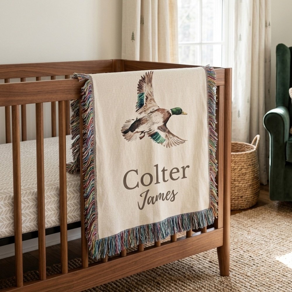 The watercolor-style mallard pattern is lively and vibrant, paired with a fresh striped border that blends vintage charm with a touch of childlike sweetness. Personalized with a custom name in an elegant font, each blanket becomes a one-of-a-kind keepsake to celebrate a child’s growth.