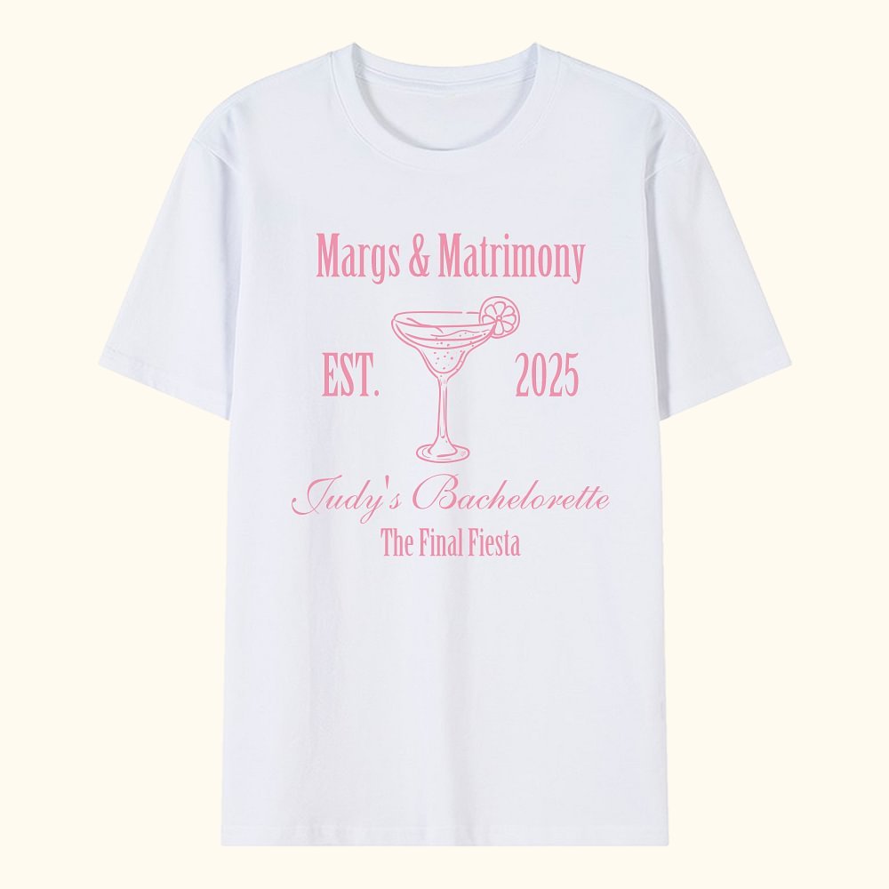 This t-shirt is a perfect blend of fun, personality, and elegance, making it the ultimate must-have for any bridesmaid, bachelorette, or wedding party. Adorned with a vibrant, multicolored print featuring a chic cocktail glasses pattern and a playful "Margs and Matrimony" message, this t-shirt is a true showstopper that will have all eyes on you.