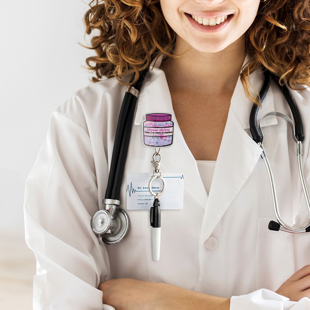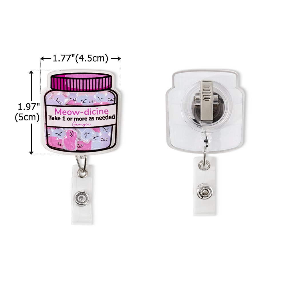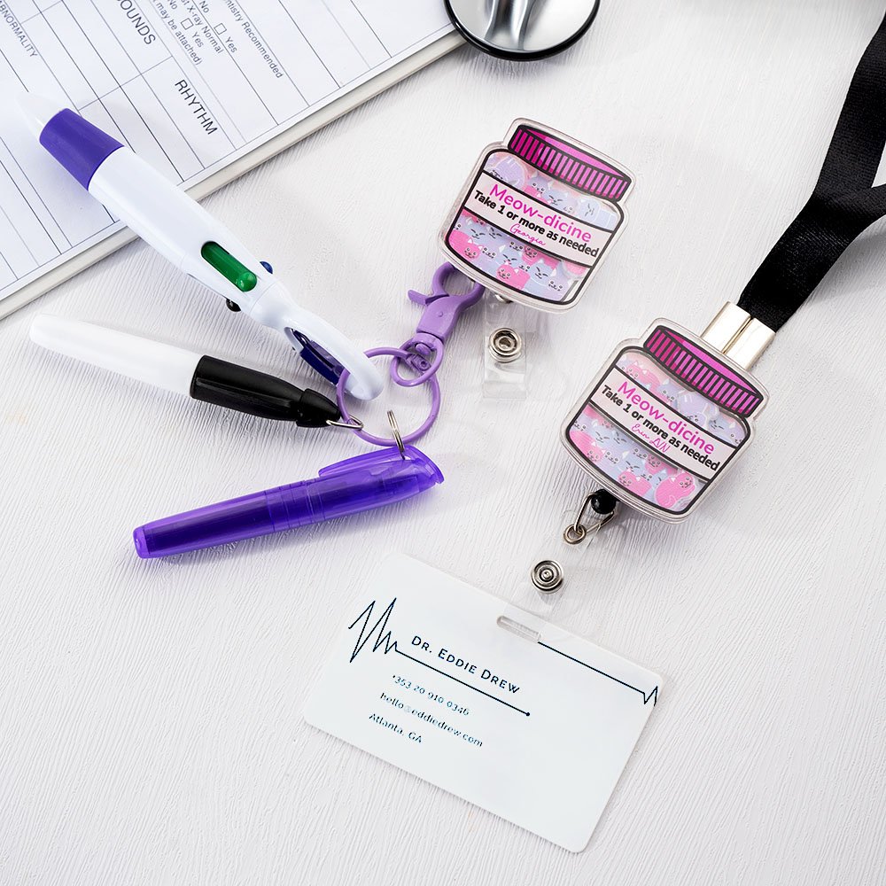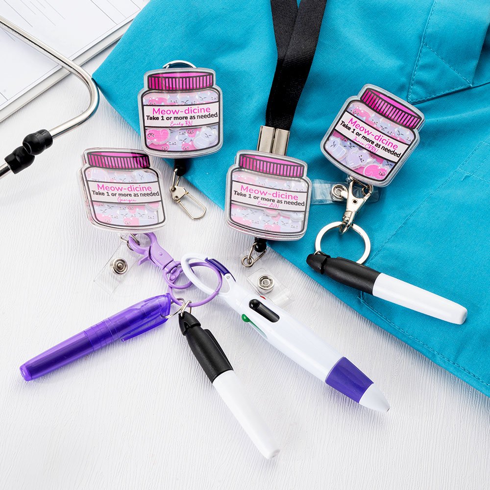 Our badge reel features a creative pill bottle design filled with adorable cats. The title "Meow-dicine" is a clever and whimsical combination of the words "medicine" and "meow," perfectly capturing the heart of cat lovers. It also allows you to showcase your name and occupation, making it a personalized accessory for professionals. Choose between a single pen or a 3-pen set to make it easy for you to take your work essentials.