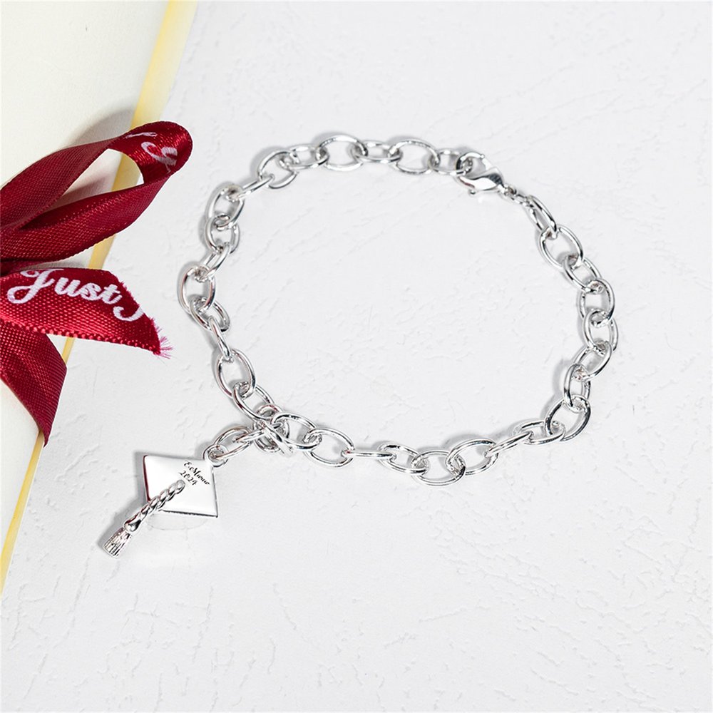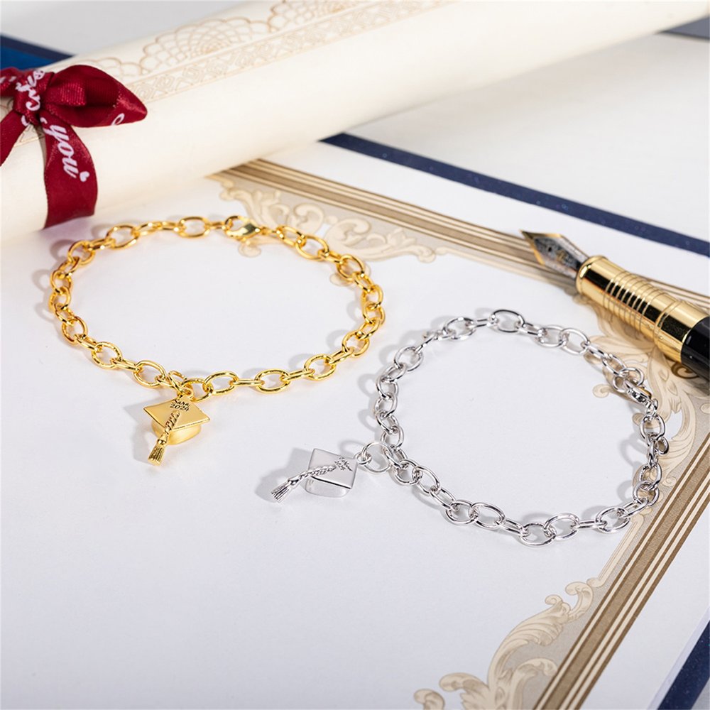 The charm of this bracelet is styled as a graduation cap, symbolizing the achievement of graduation. You can add your name to the charm to make this bracelet truly unique. With three colors to choose from, it pairs beautifully with various outfits, including skirts, dresses, shirts, and coats. Stand out from the crowd, grab everyone's attention, and enhance your allure every day.