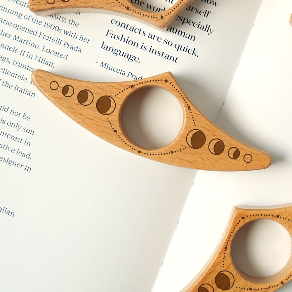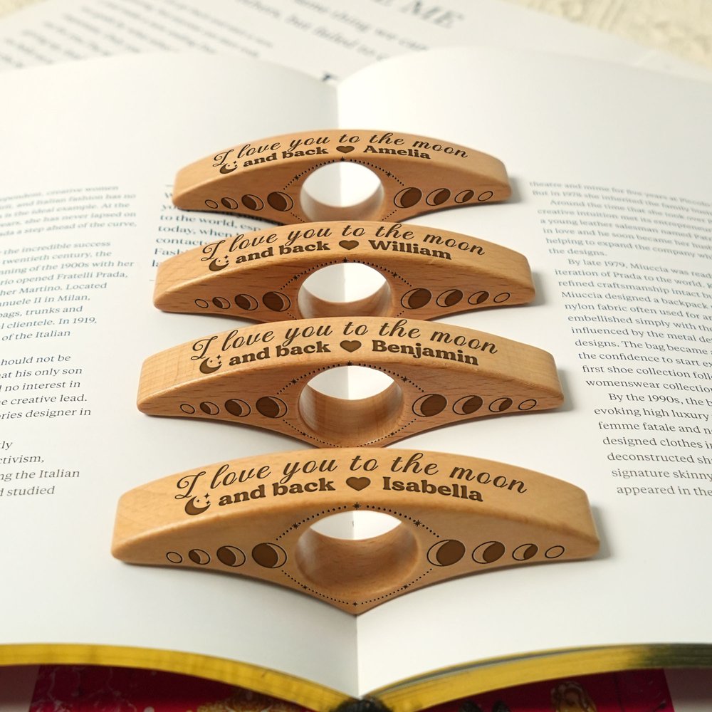The beech page holder with engraved moon phases alongside the phrase “I love you to the moon and back”. You can add a custom name to the design, which features engraved moon phases. This turns the page holder into a unique reading companion that reflects your love for books and celestial charm.