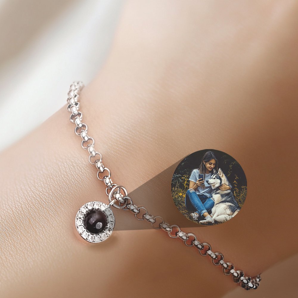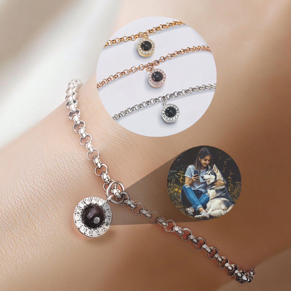 Our delicate projection bracelet features several sparkling round zirconias surrounding a circular projection pendant, allowing your beloved image to be projected in a beautiful aura. We also carefully transfer your selected photos to photo stones using state-of-the-art technology. Whether it's a snapshot of a loved one, a breathtaking landscape, or a cherished pet, this bracelet lets you take it with you.