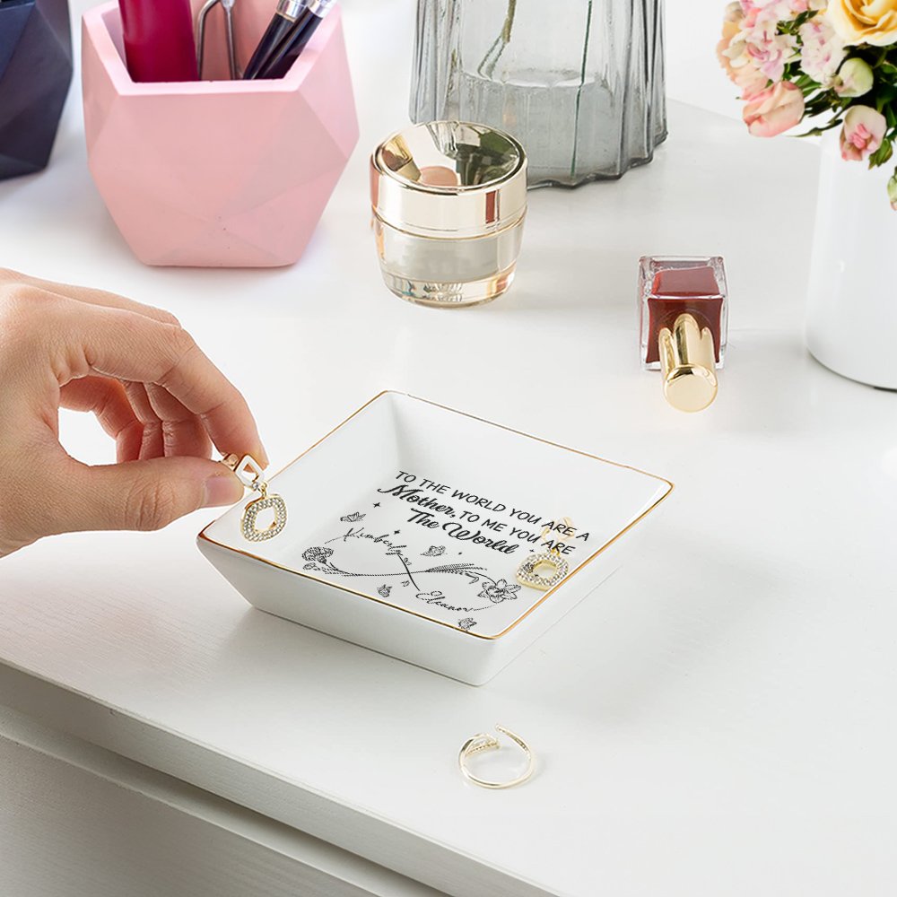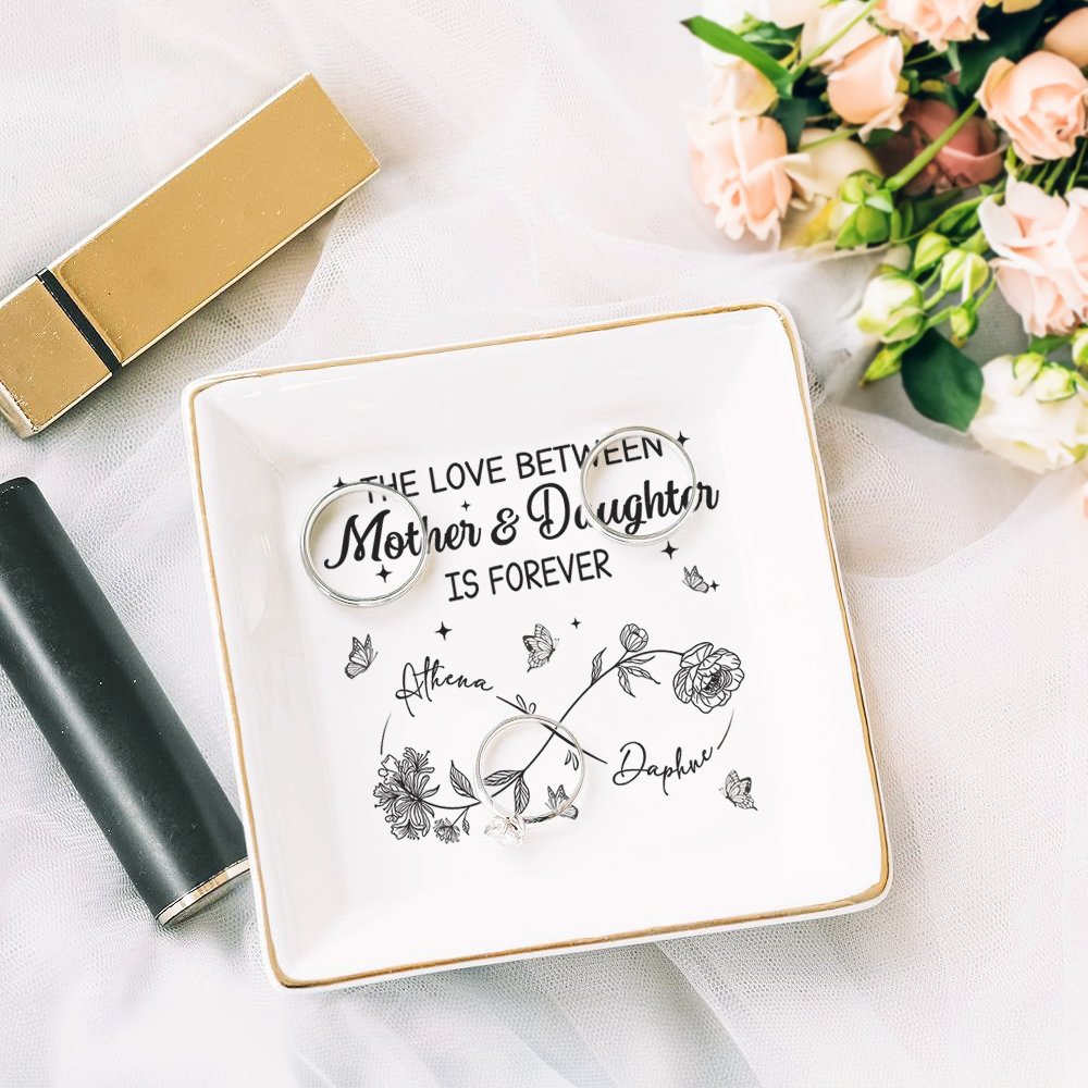 This charming ceramic jewelry dish features a beautifully intricate infinity birth flower, you can customize it with the mom's and kid's names and transform it into a unique keepsake that celebrates individuality.