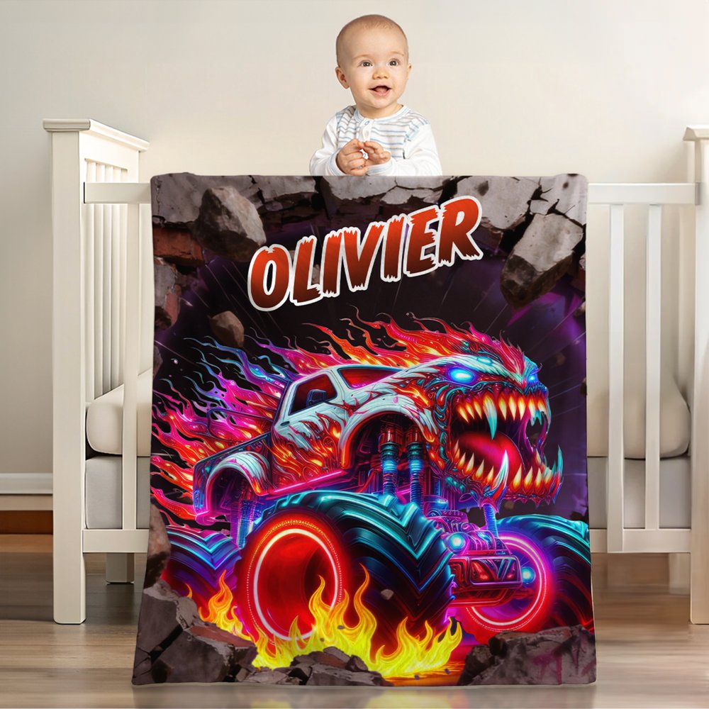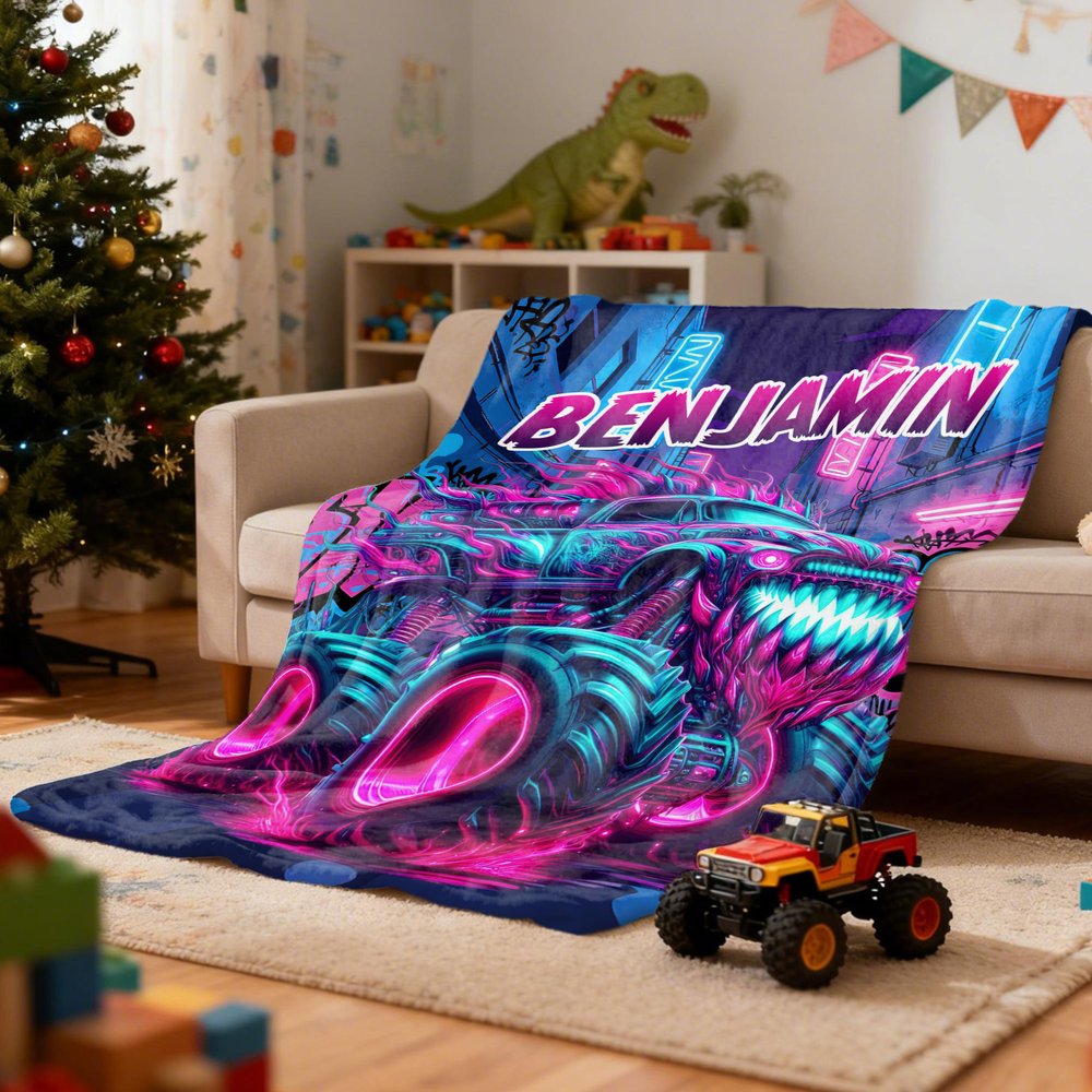 This blanket features a fun monster neon truck as its core design element, paired with vibrant colors that instantly ignite a child's playful enthusiasm. It supports customization with the child's name, cleverly blending personalization with trendy patterns. The overall design is both personalized and visually appealing, satisfying children's aesthetic needs while showcasing a sense of exclusivity, making the blanket stand out from the crowd.