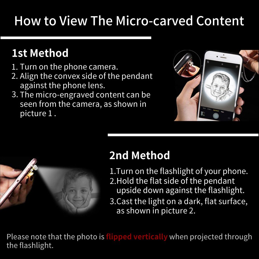 1st Method - 1. Turn on the phone camera. 2. Align the convex side of the pendant against the phone lens. 3. The micro-engraved content can be seen from the camera. 2nd Method - 1. Turn on the flashlight of your phone. 2. Hold the flat side of the pendant against the flashlight. 3. Cast the light on a dark, flat surface.