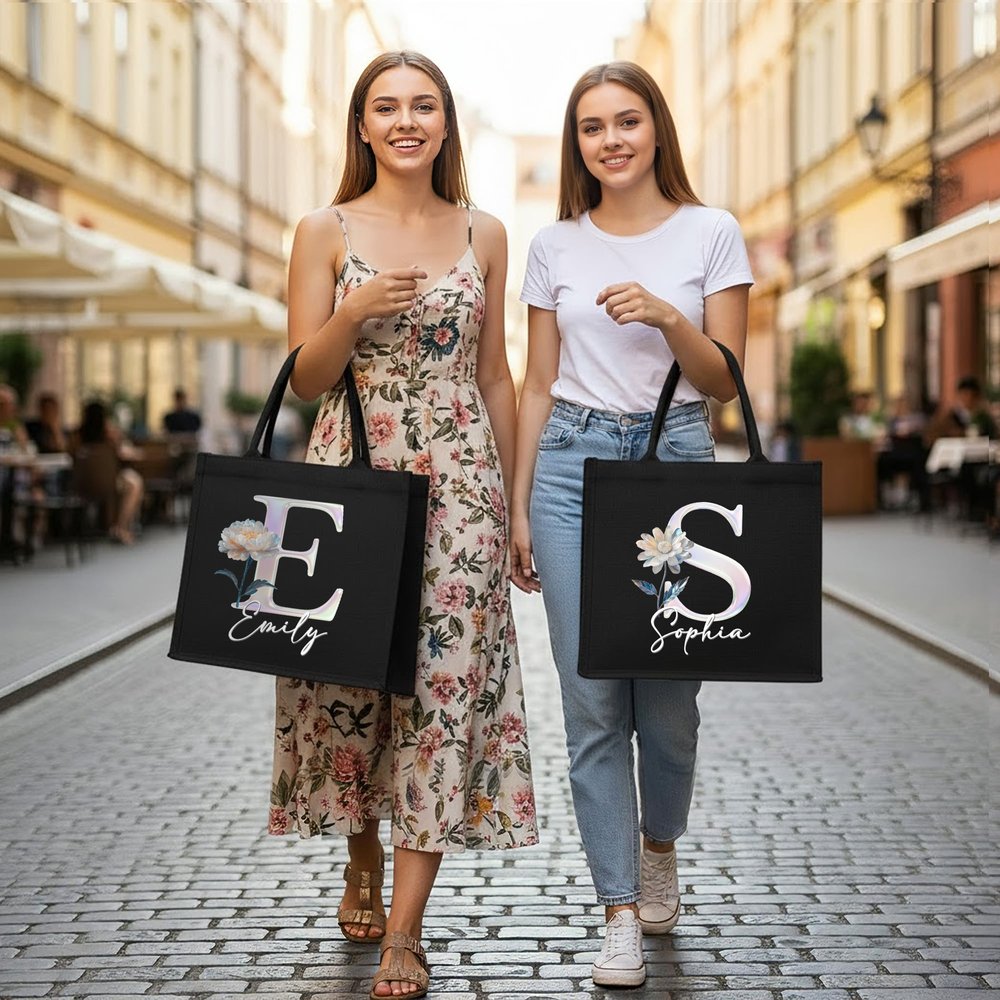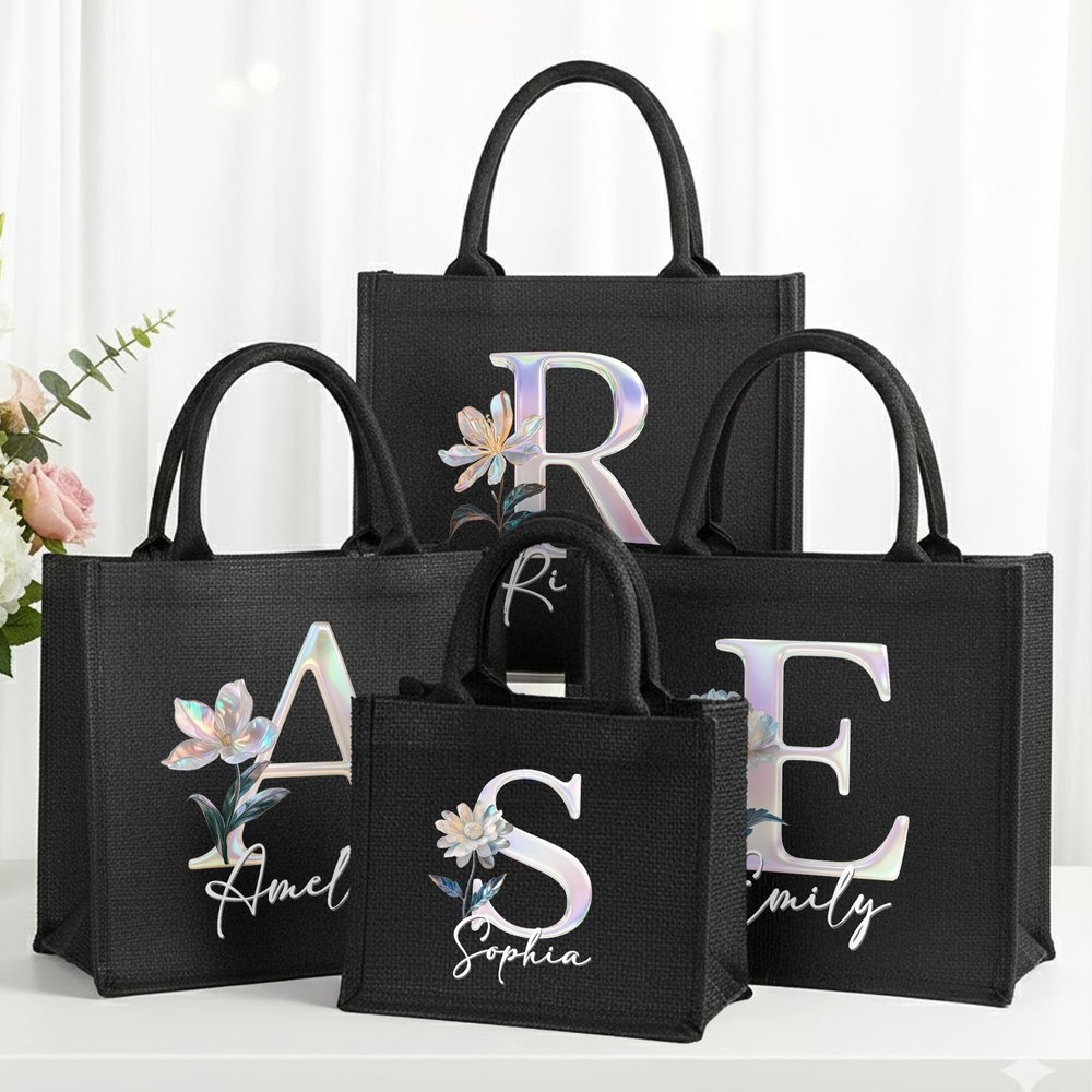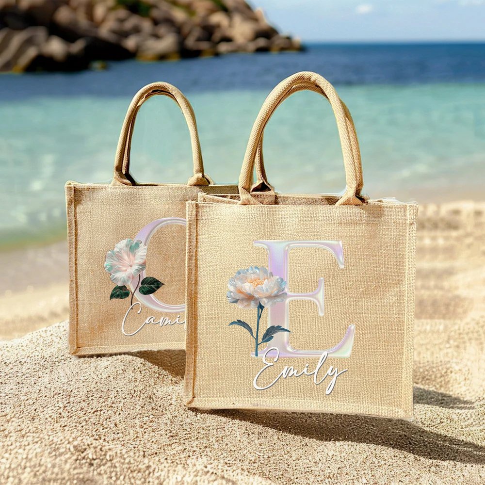 Personalized Mother of Pearl Effect Birth Flower Initial Jute Tote Bag with Name Birthday Christmas Anniversary Gift for Women Family Friends