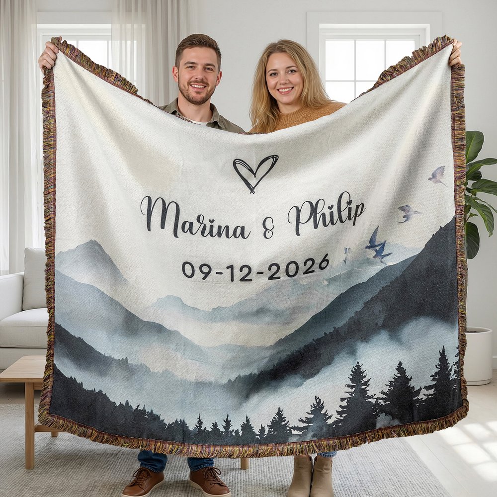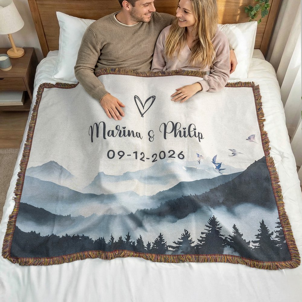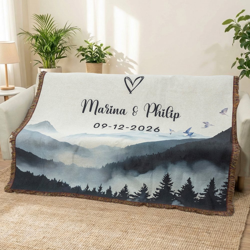 The blanket features a continuous mountain silhouette as its core pattern, symbolizing love as steadfast and enduring as the mountains and hills. It supports personalized couples' names and significant dates, weaving unique emotions into a simple yet elegant visual language, creating a warm keepsake that carries vows and memories through time.