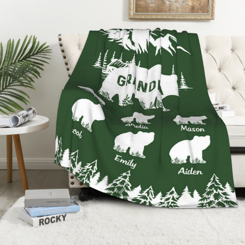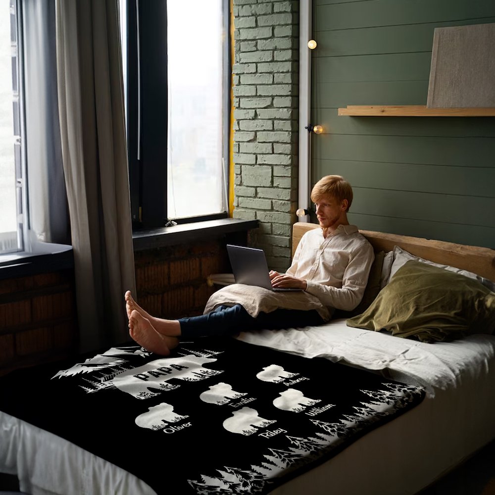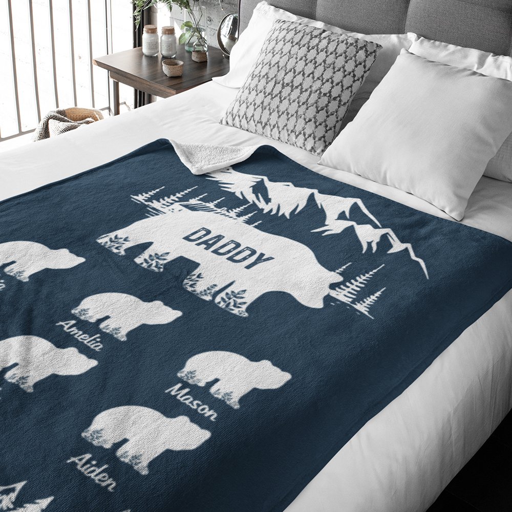 Our blanket is designed with elements of daddy bear and his cubs, and decorated with forest and mountain patterns. The emotions between animals are often warm and pure, which is a unique way to express the theme of fatherly love. You can add dad and kids' names to make it a special keepsake between you.