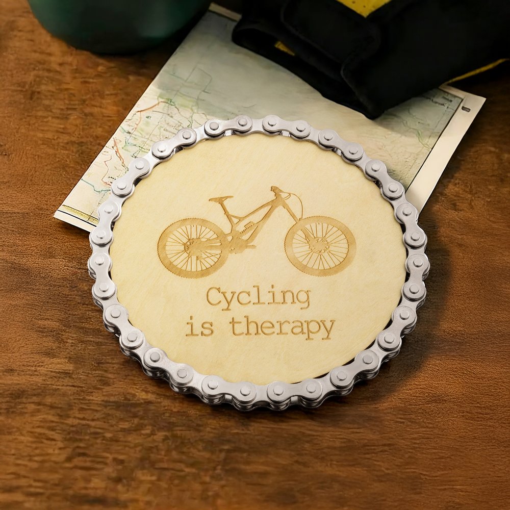 The coaster has a durable basswood base and a corrosion-resistant bicycle chain frame. The surface offers five bicycle-style options (Road/Vintage/City/BMX/Mountain Bike). At the same time, the preserved wear marks on the chain segments create a visual dialogue between mechanical aesthetics and the natural wood grain.
