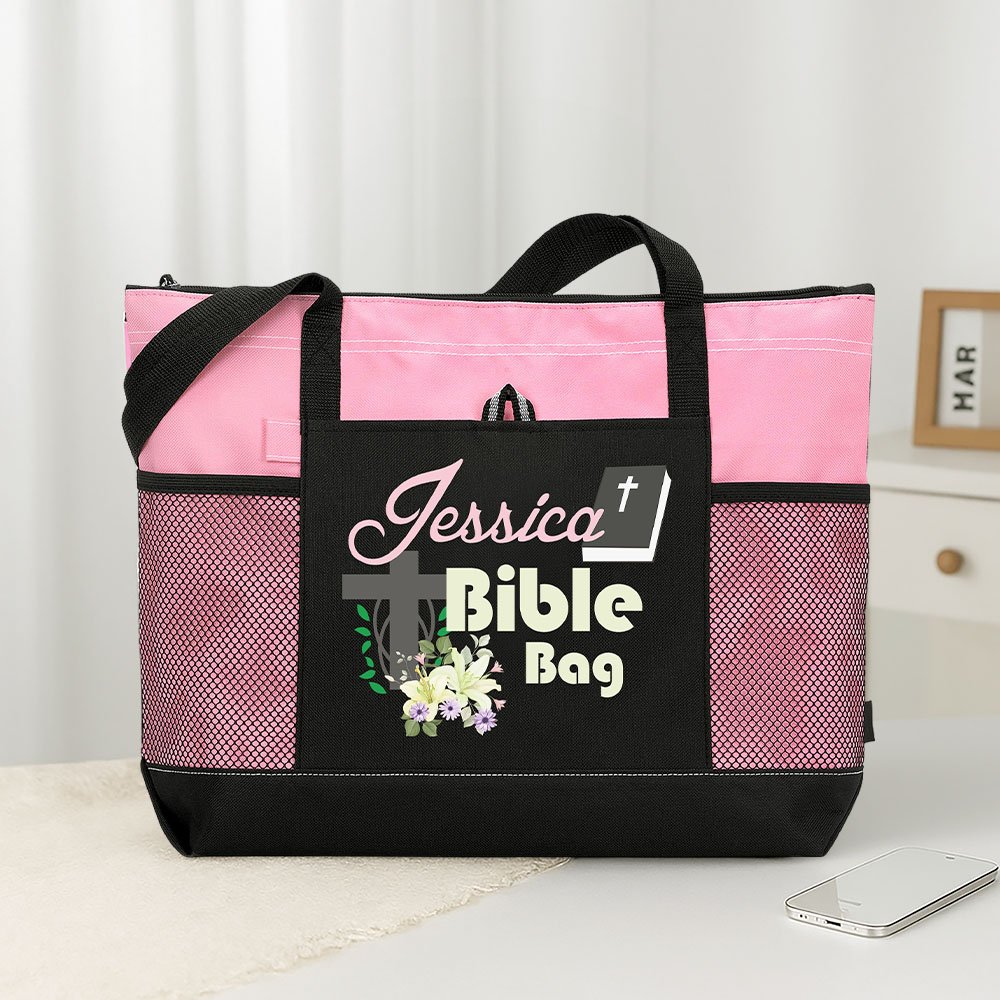 What sets this tote bag apart is the ability to customize your name on it using our special fonts and colors, making it your very own item that will stand out when you attend church events.