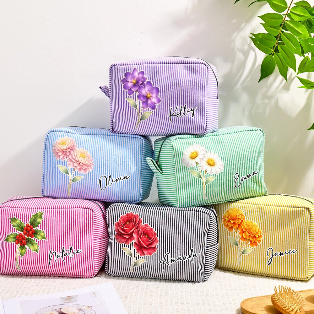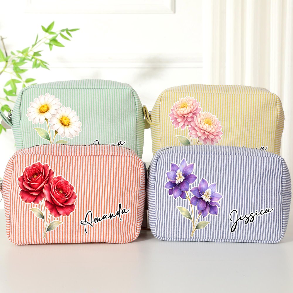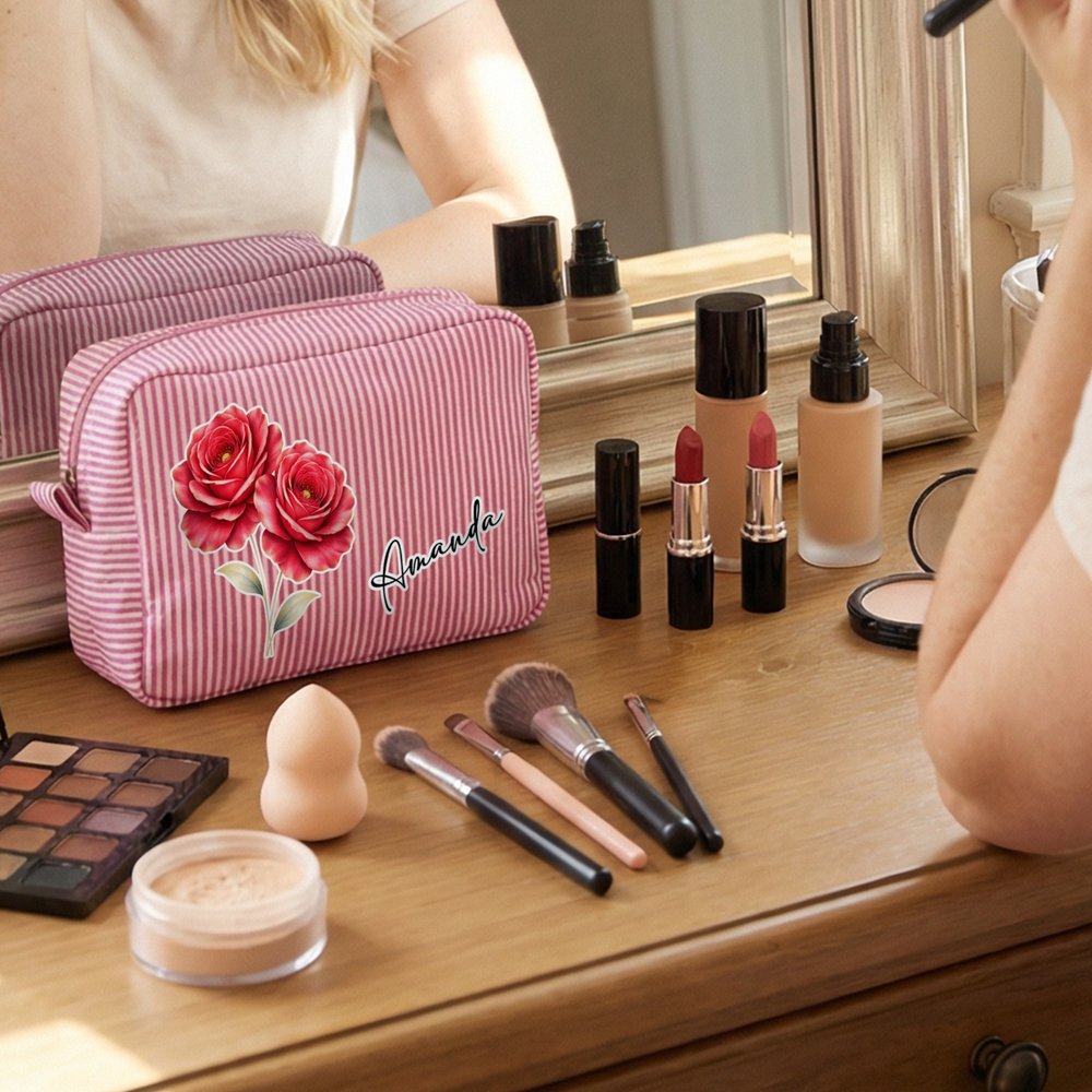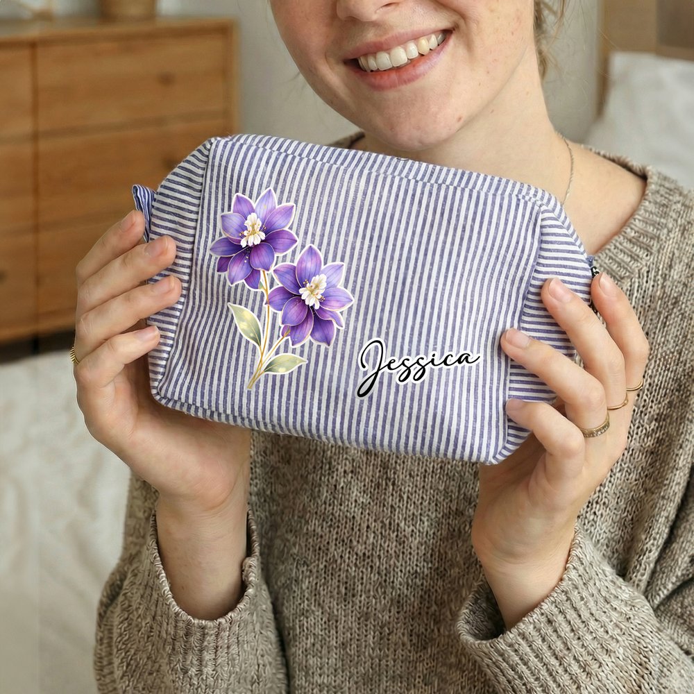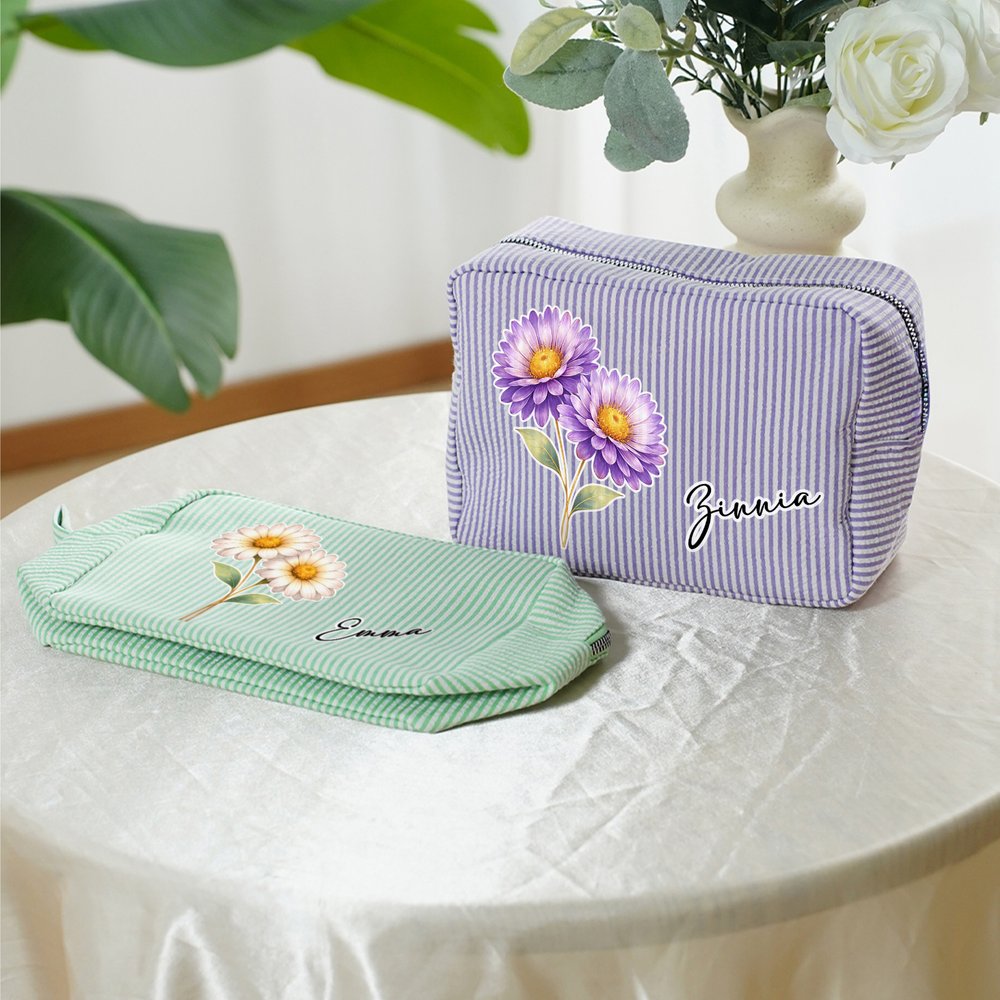 Featuring a refreshing striped base adorned with birth flower patterns corresponding to different months, the vibrant flowers are lifelike, seemingly telling a unique story. The addition of a personalized name makes each makeup bag a one-of-a-kind item, showcasing individuality and imbuing it with a sense of personal ritual.