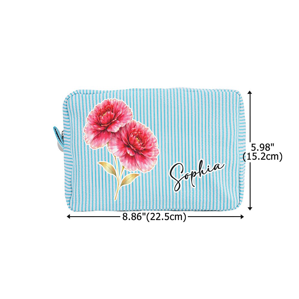 Featuring a refreshing striped base adorned with birth flower patterns corresponding to different months, the vibrant flowers are lifelike, seemingly telling a unique story. The addition of a personalized name makes each makeup bag a one-of-a-kind item, showcasing individuality and imbuing it with a sense of personal ritual.